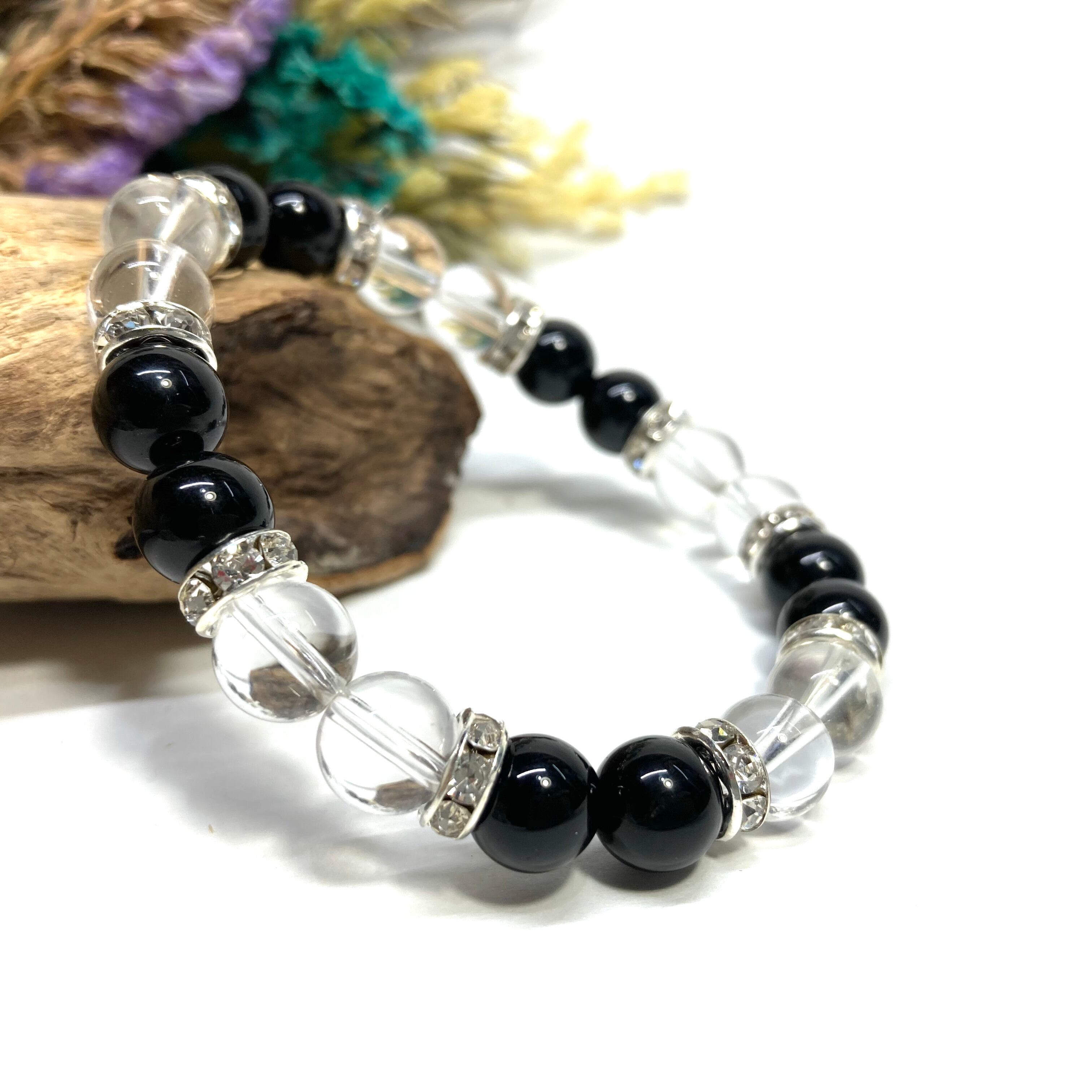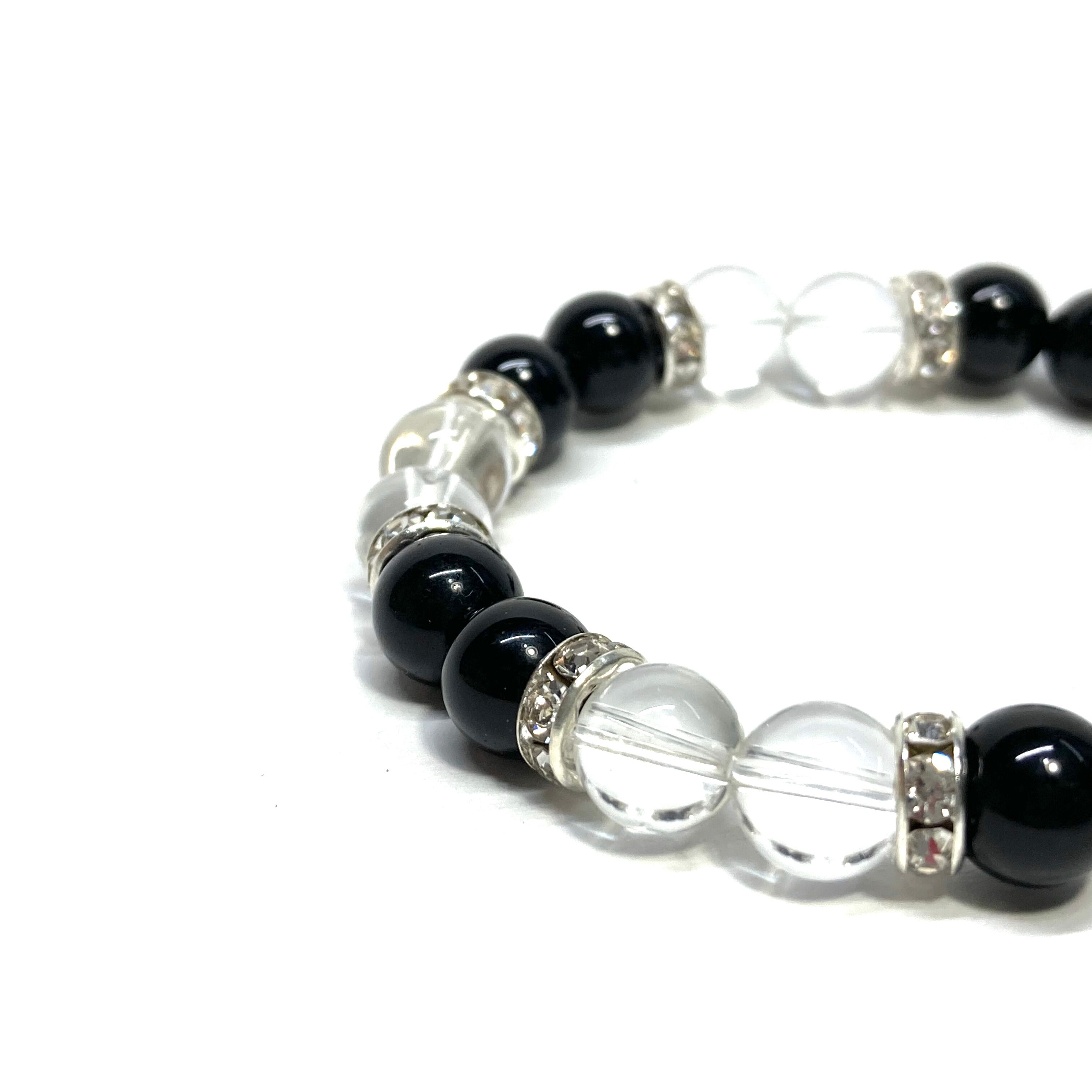 こちらは、8mm玉のブラックスピネルと水晶を使用した天然石ブレスレットです。石との間に挟まれたロンデルがアクセントになったデザインです。サイズは内周約15cmです。