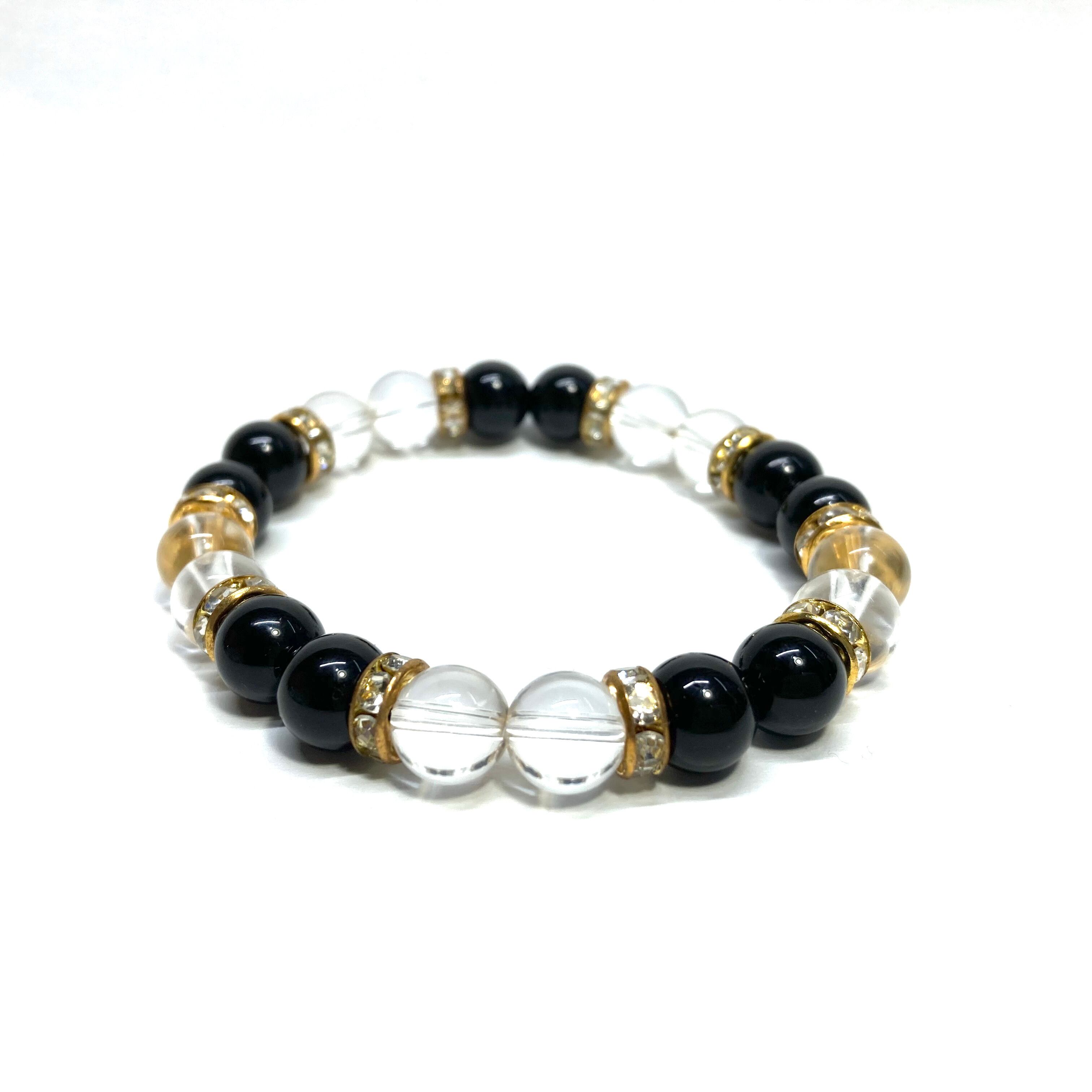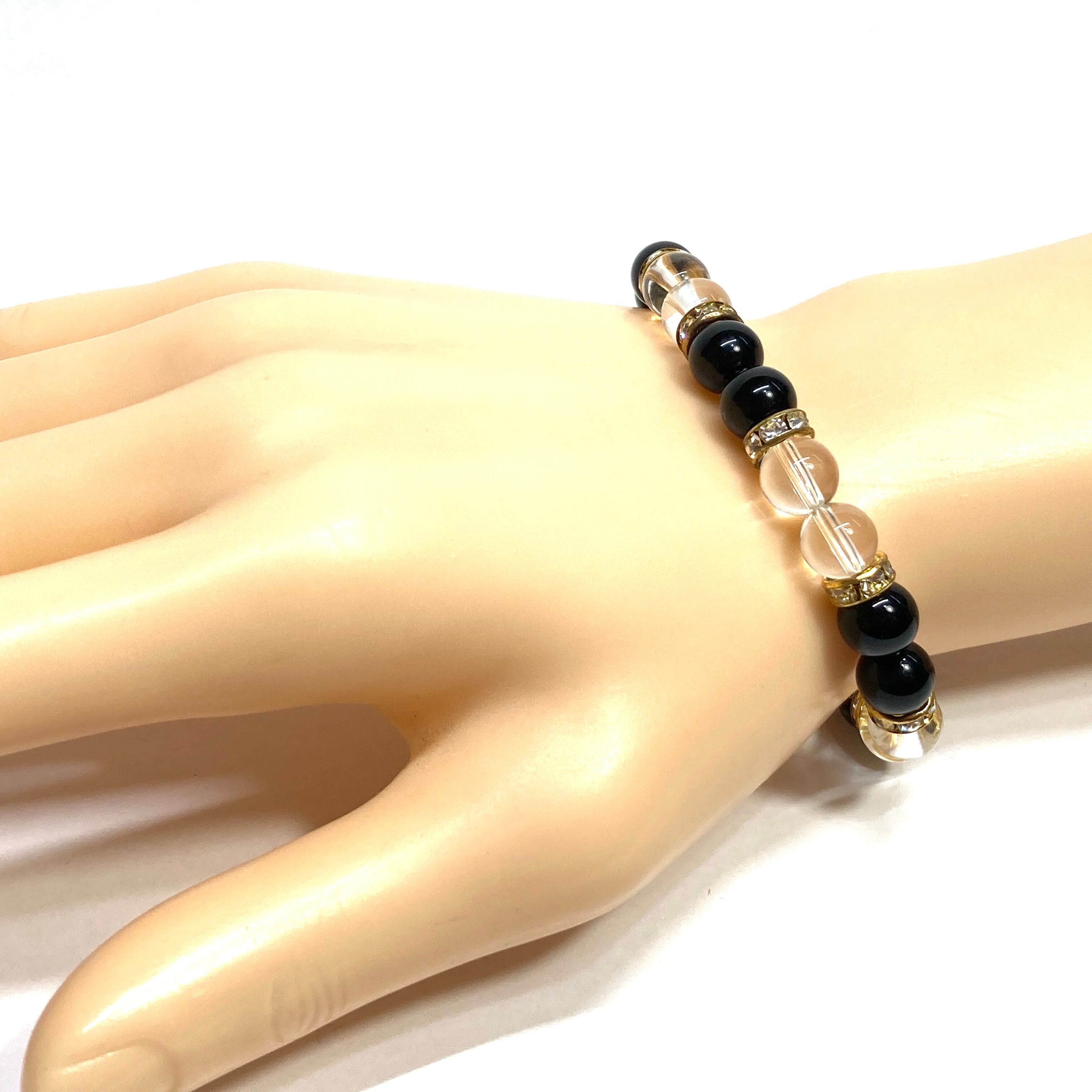こちらは、8mm玉のブラックスピネルと水晶を使用した天然石ブレスレットです。石との間に挟まれたロンデルがアクセントになったデザインです。サイズは内周約15cmです。