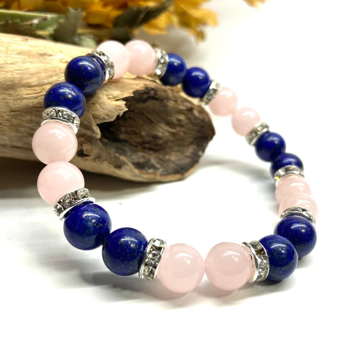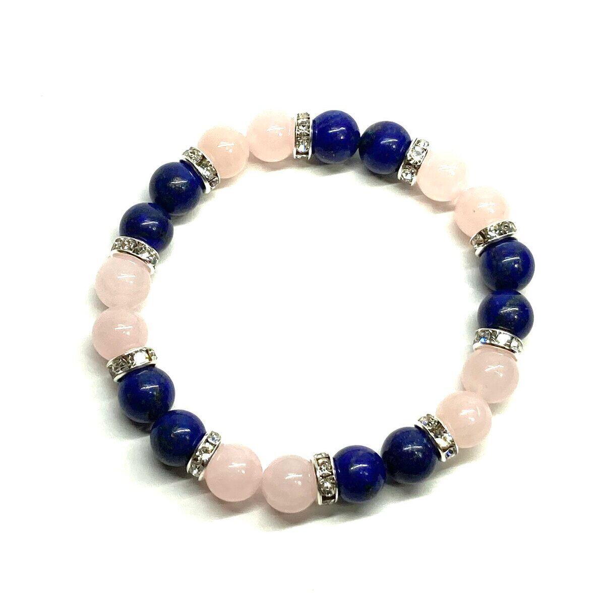 こちらは、8mm玉のラピスラズリとローズクォーツを使ったパワーストーンブレスレットです。シンプルなデザインでどんなコーディネートにも合わせやすいデザインに仕上げています。サイズは内周 約15cmです。気になる方は是非この機会にどうぞ。