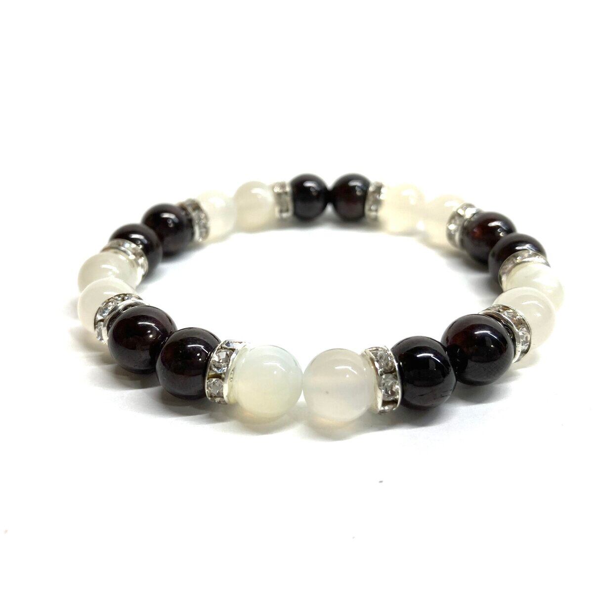こちらは、8mm玉のムーンストーンとガーネットを使ったパワーストーンブレスレットです。シンプルなデザインでどんなコーディネートにも合わせやすいデザインに仕上げています。サイズは内周 約15cmです。気になる方は是非この機会にどうぞ。