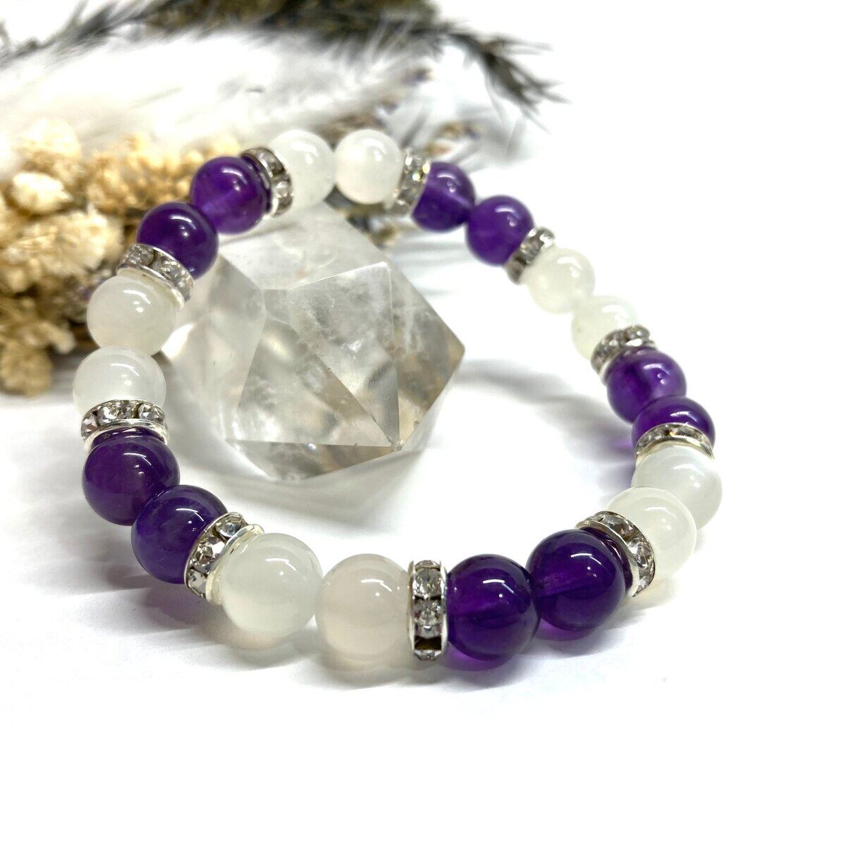 こちらは、8mm玉のムーンストーンとアメジストを使ったパワーストーンブレスレットです。シンプルなデザインでどんなコーディネートにも合わせやすいデザインに仕上げています。サイズは内周 約15cmです。気になる方は是非この機会にどうぞ。