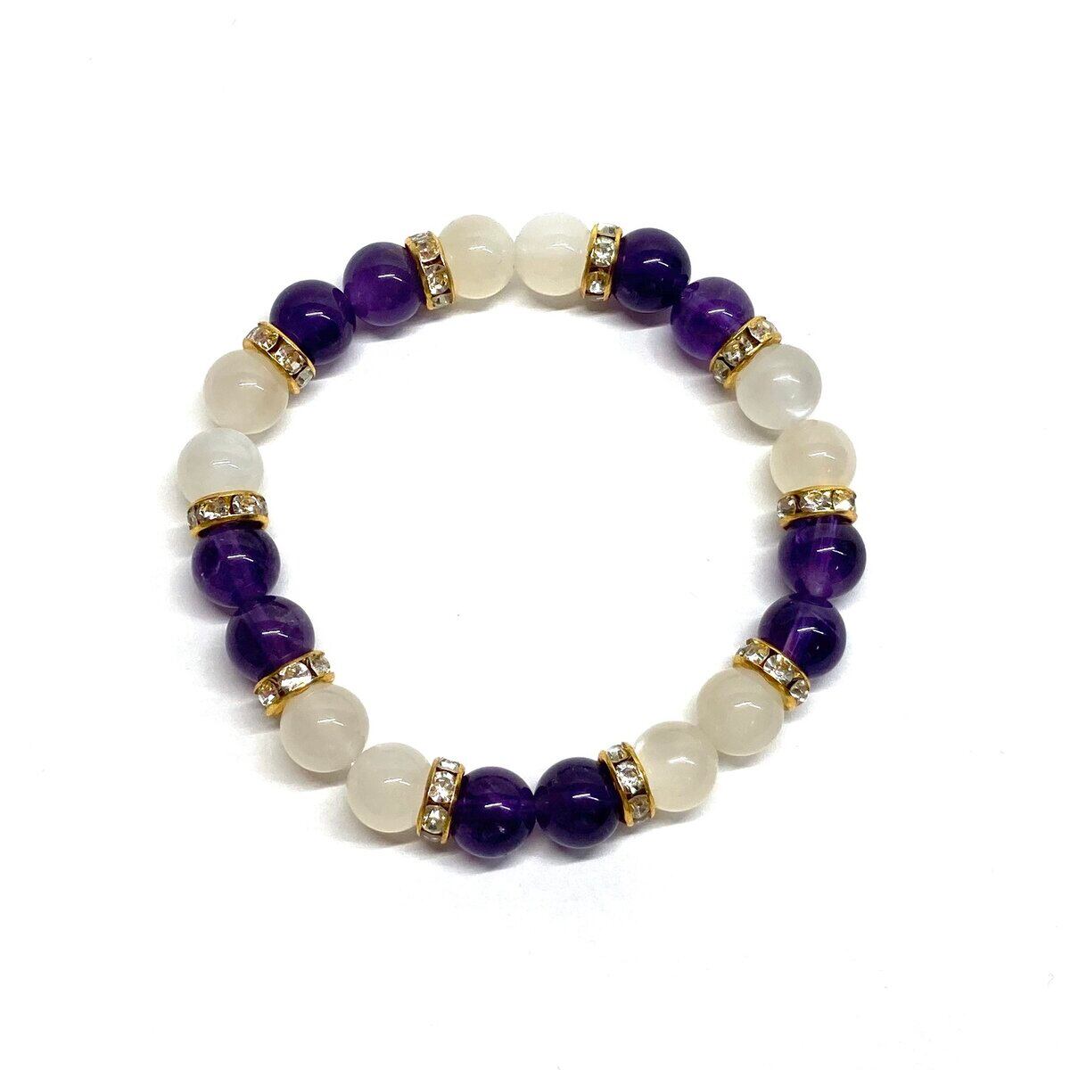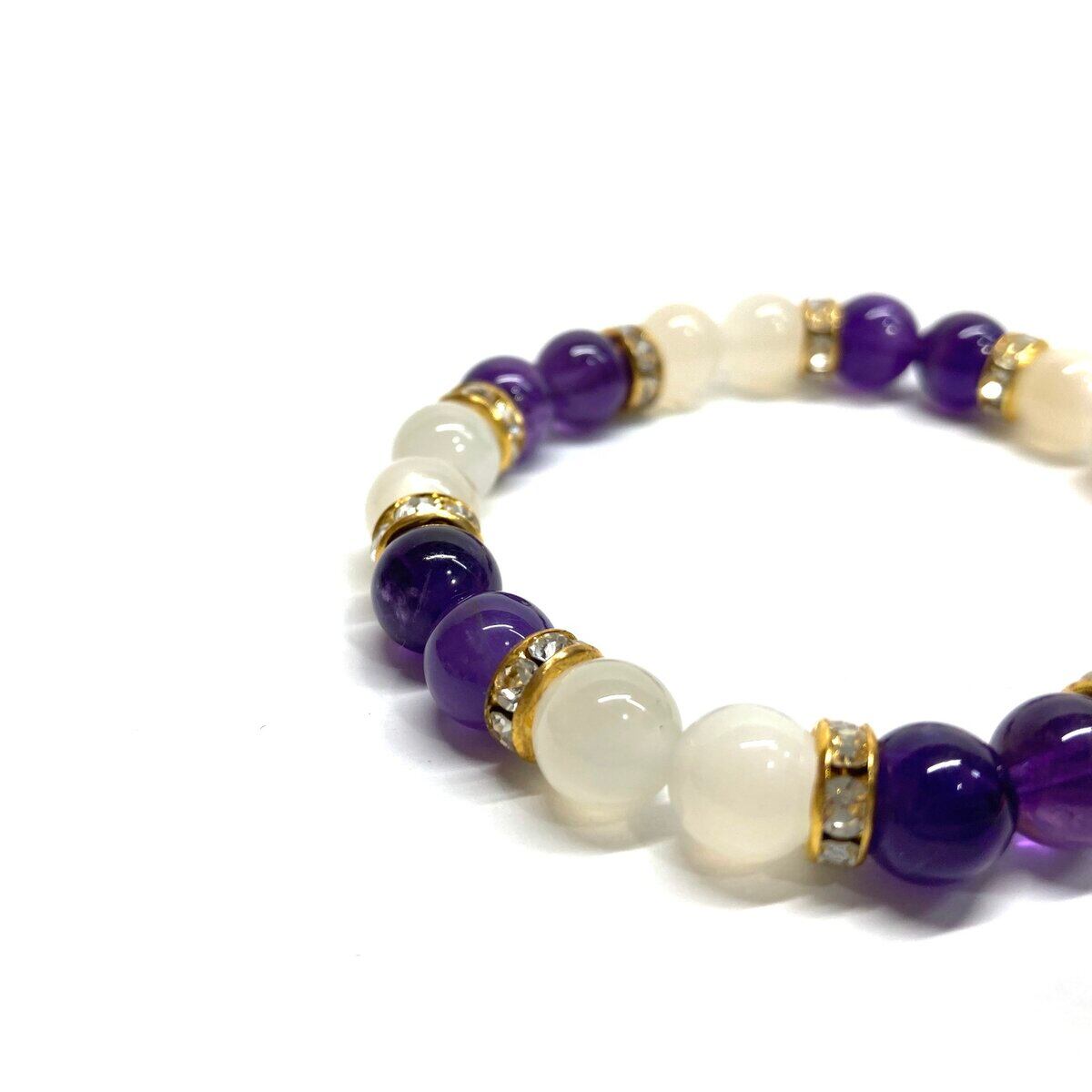 こちらは、8mm玉のムーンストーンとアメジストを使ったパワーストーンブレスレットです。シンプルなデザインでどんなコーディネートにも合わせやすいデザインに仕上げています。サイズは内周 約15cmです。気になる方は是非この機会にどうぞ。