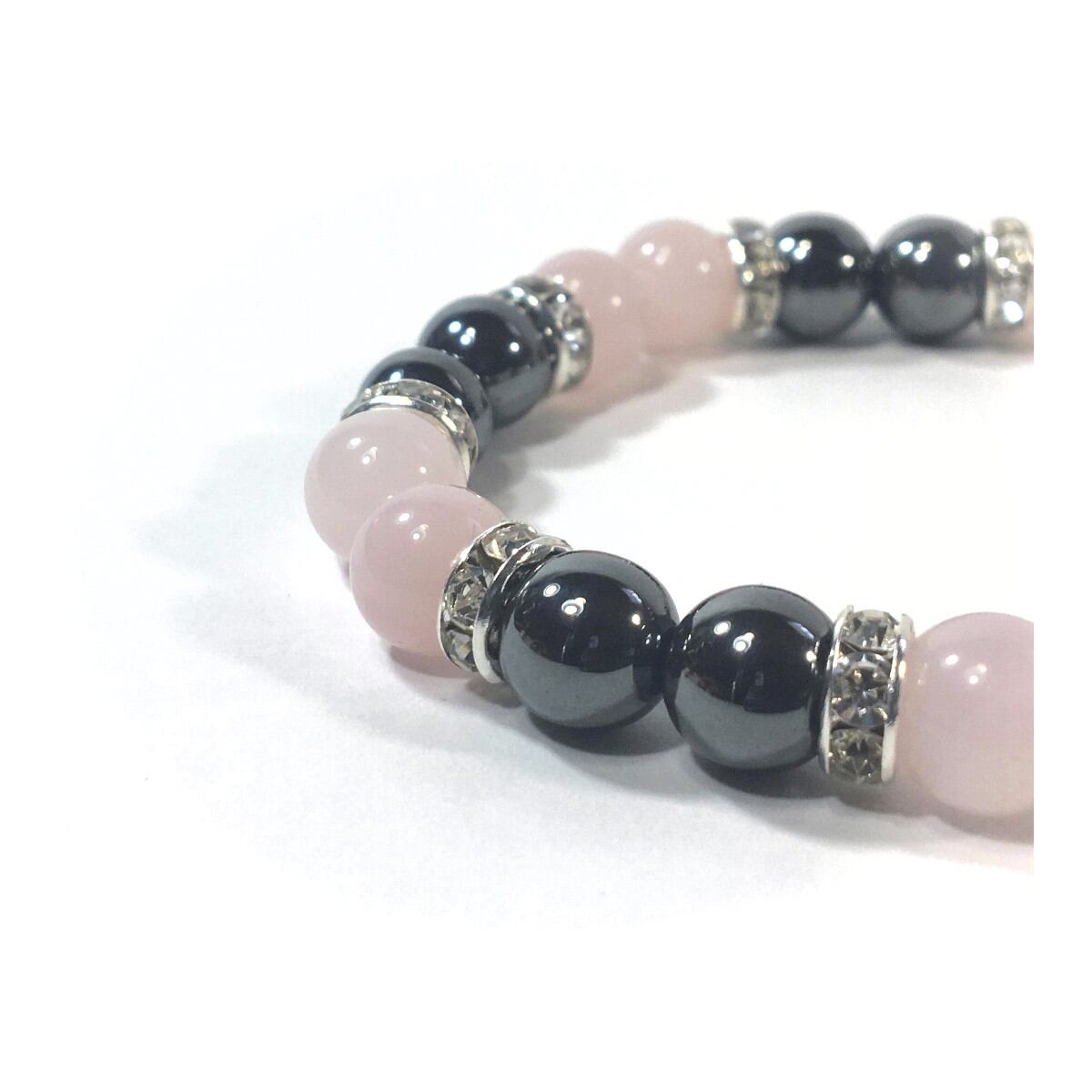 こちらは、8mm玉のローズクォーツとヘマタイトを使ったパワーストーンブレスレットです。シンプルなデザインでどんなコーディネートにも合わせやすいデザインに仕上げています。サイズは内周約15cmです。気になる方は是非この機会にどうぞ。
