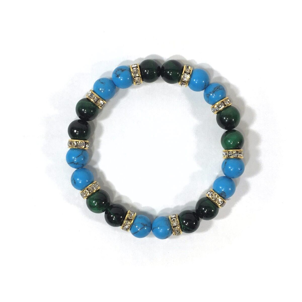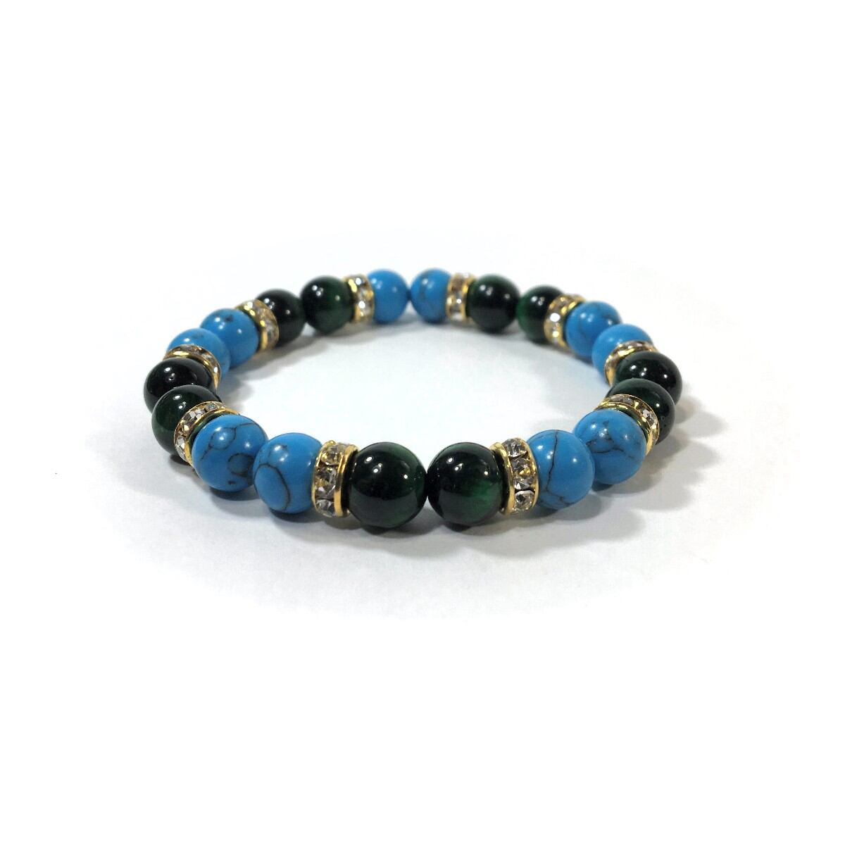 こちらは、8mm玉のターコイズとグリーンタイガーアイを使ったパワーストーンブレスレットです。シンプルなデザインでどんなコーディネートにも合わせやすいデザインに仕上げています。サイズは内周約15cmです。気になる方は是非この機会にどうぞ。