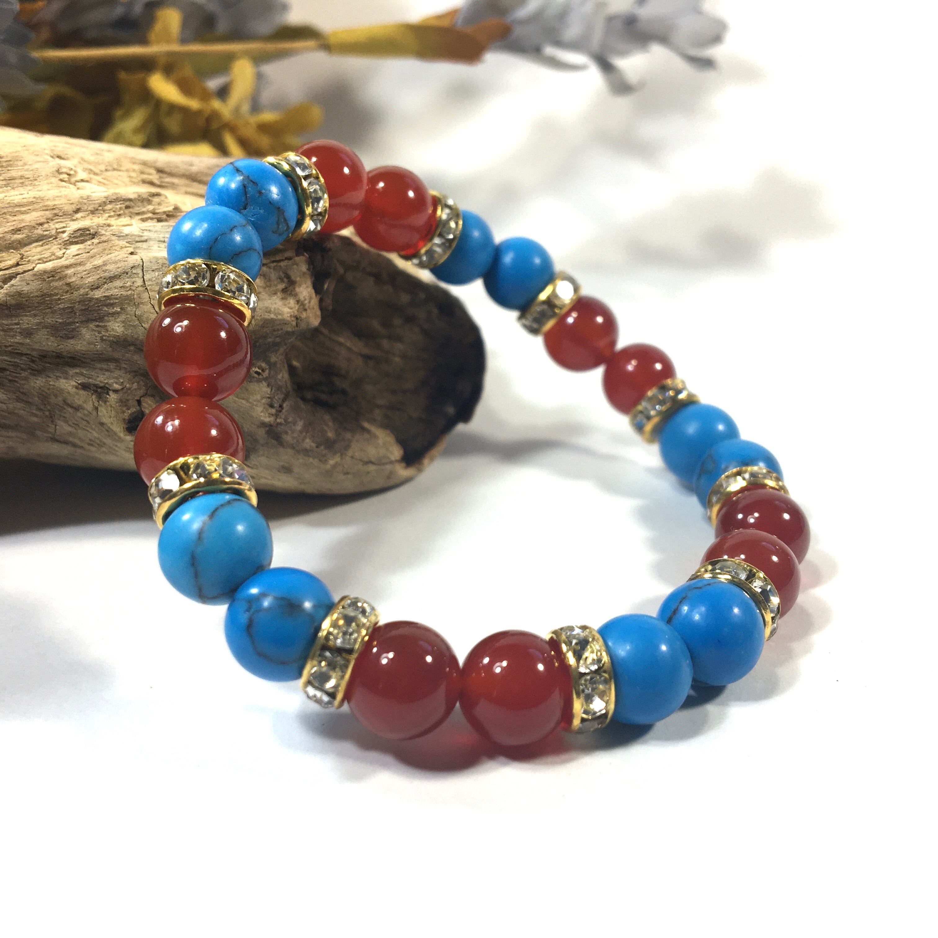 こちらは、8mm玉のターコイズと赤メノウを使ったパワーストーンブレスレットです。シンプルなデザインでどんなコーディネートにも合わせやすいデザインに仕上げています。サイズは内周約15cmです。気になる方は是非この機会にどうぞ。