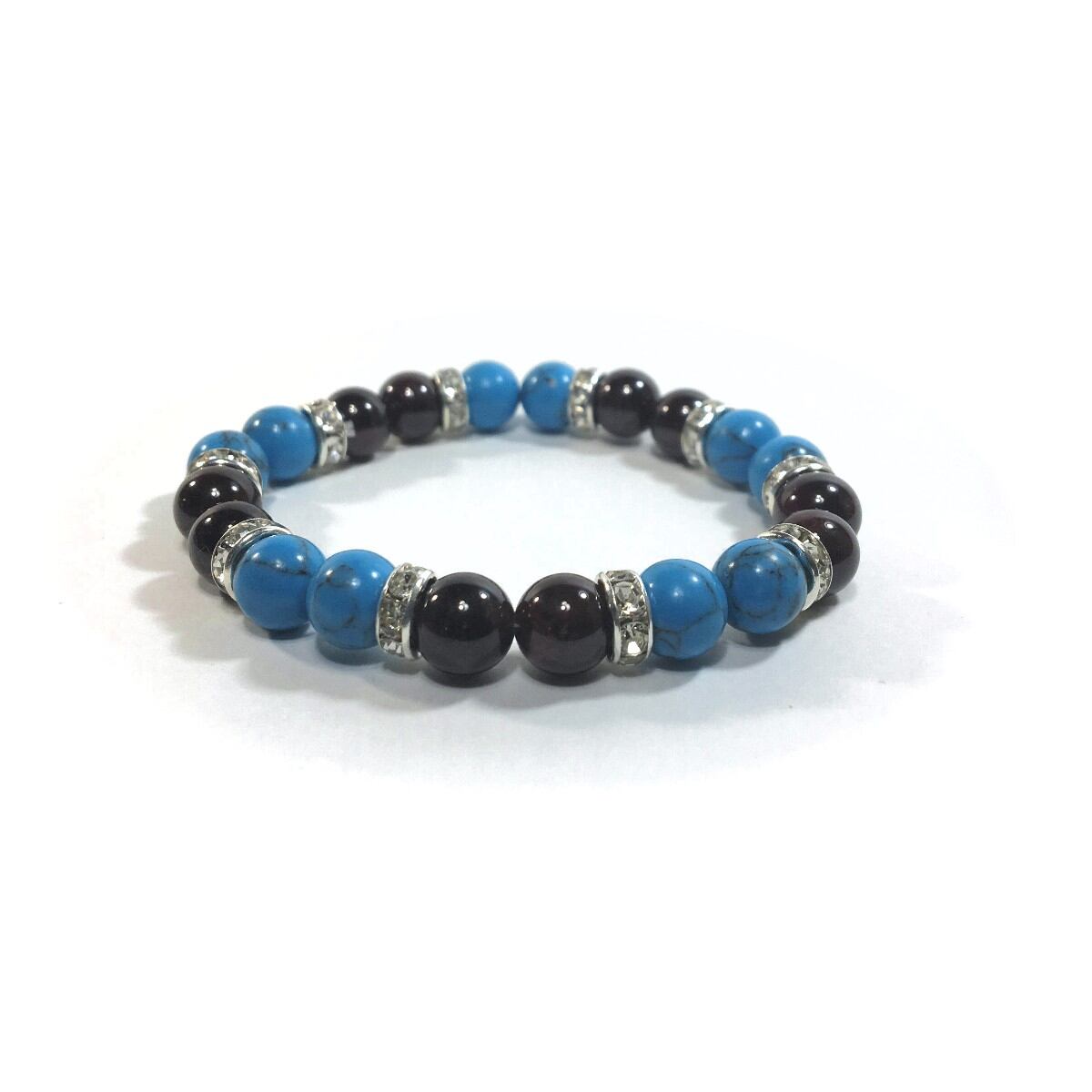 こちらは、8mm玉のターコイズとガーネットを使ったパワーストーンブレスレットです。シンプルなデザインでどんなコーディネートにも合わせやすいデザインに仕上げています。サイズは内周約15cmです。気になる方は是非この機会にどうぞ。