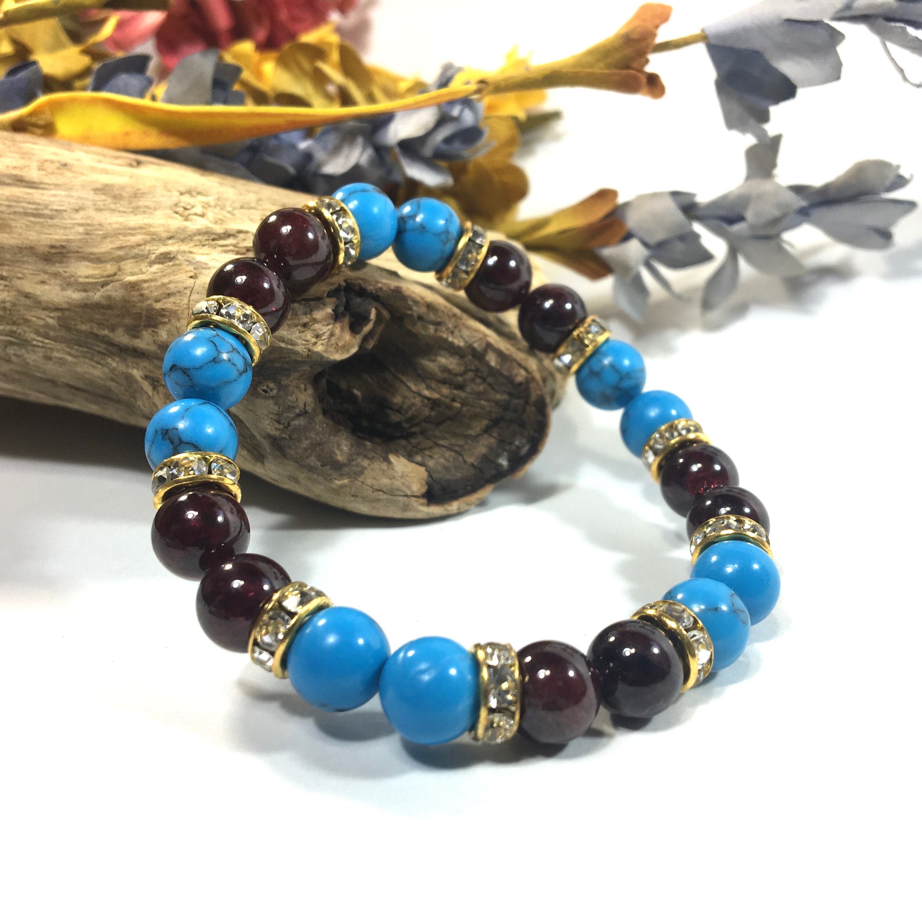 ターコイズ&ガーネット パワーストーン ブレスレット 天然石ブレス 8mm(ゴールド)レディース 女性 数珠ブレス 開運 プレゼント ギフト