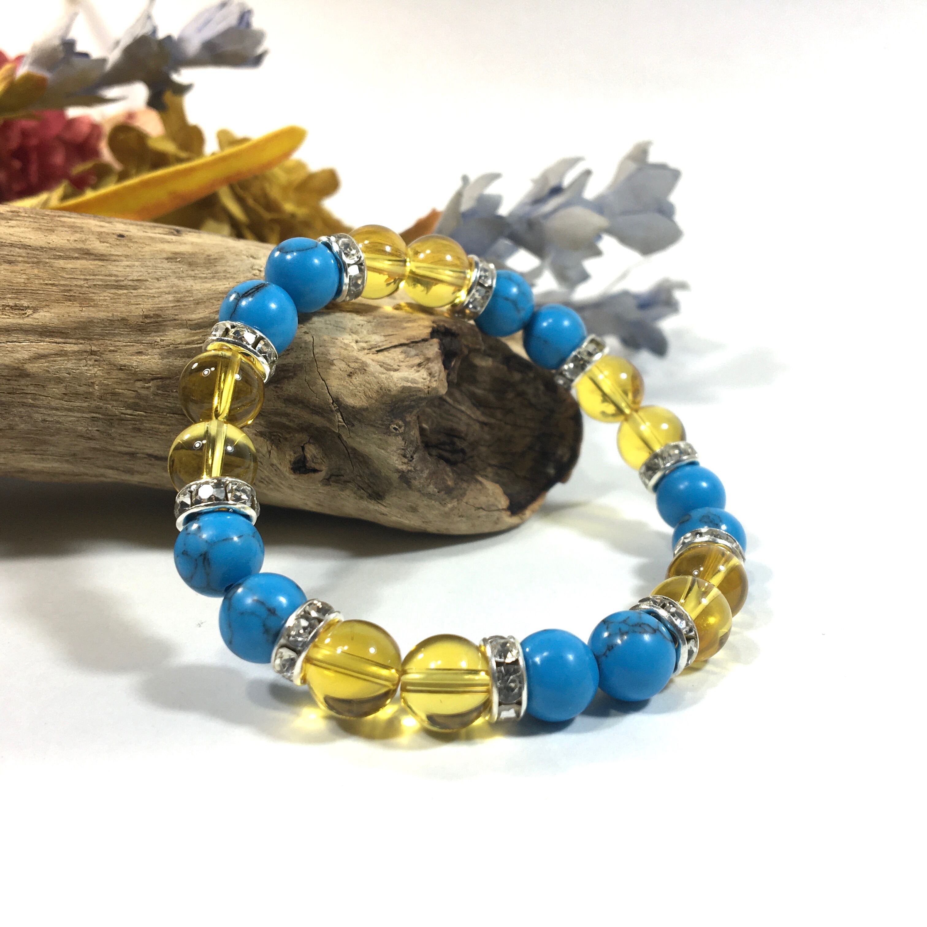 こちらは、8mm玉のターコイズとシトリンを使ったパワーストーンブレスレットです。シンプルなデザインでどんなコーディネートにも合わせやすいデザインに仕上げています。サイズは内周約15cmです。気になる方は是非この機会にどうぞ。
