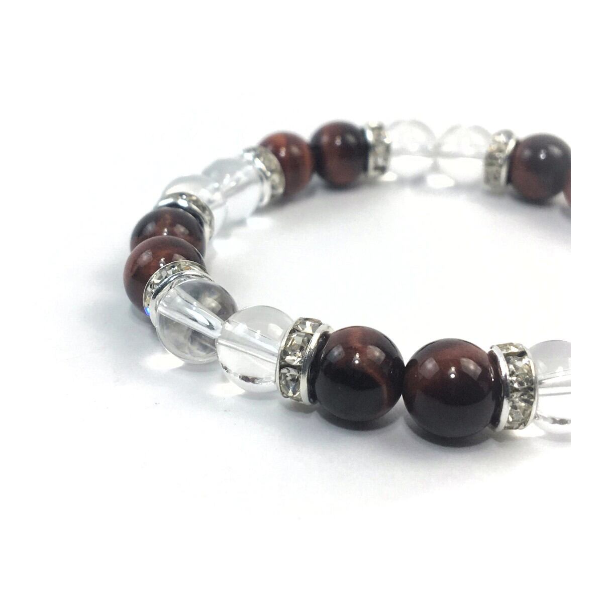 こちらは、8mm玉の水晶とレッドタイガーアイを使ったパワーストーンブレスレットです。シンプルなデザインでどんなコーディネートにも合わせやすいデザインに仕上げています。サイズは内周約15cmです。気になる方は是非この機会にどうぞ。