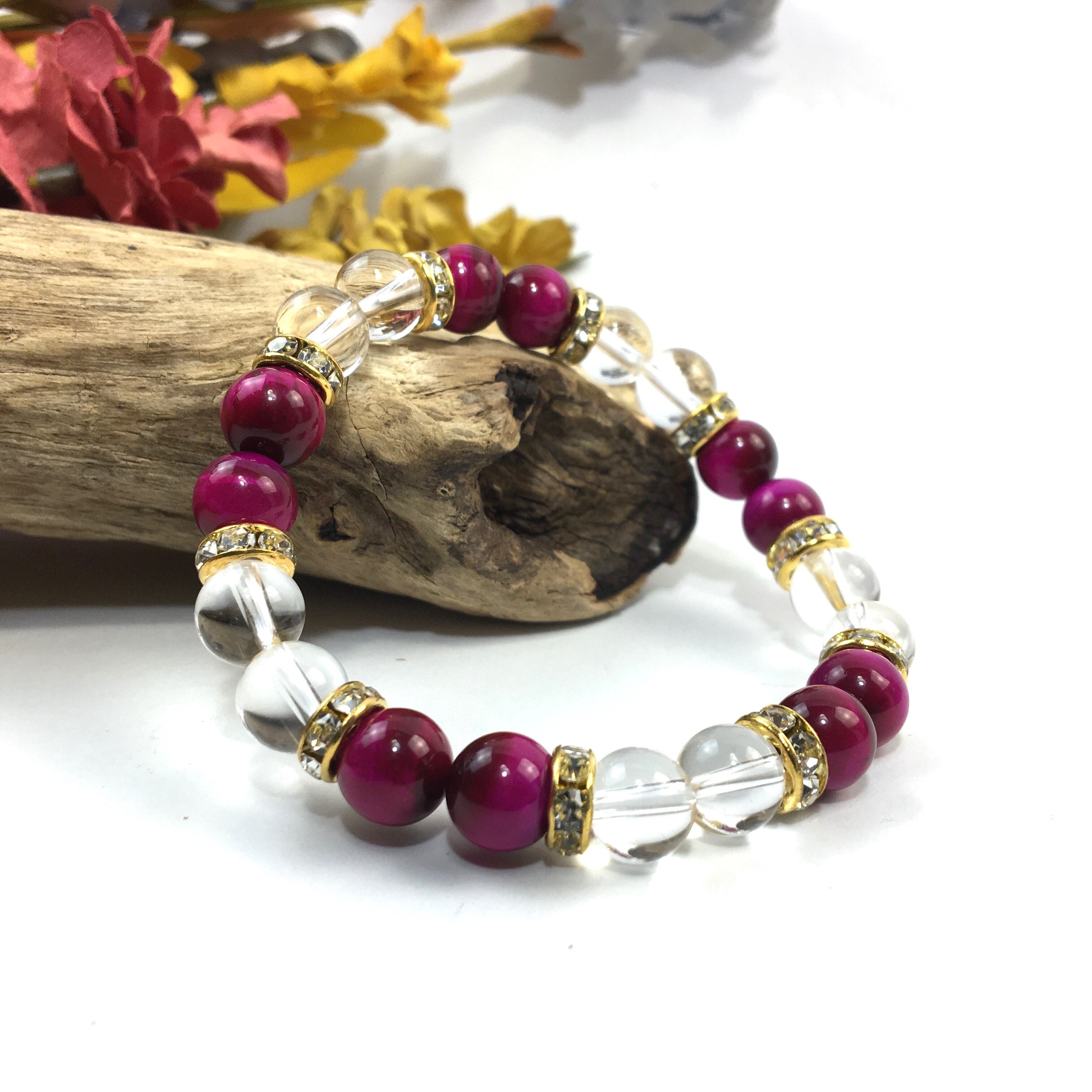 こちらは、8mm玉の水晶とピンクタイガーアイを使ったパワーストーンブレスレットです。シンプルなデザインでどんなコーディネートにも合わせやすいデザインに仕上げています。サイズは内周約15cmです。気になる方は是非この機会にどうぞ。