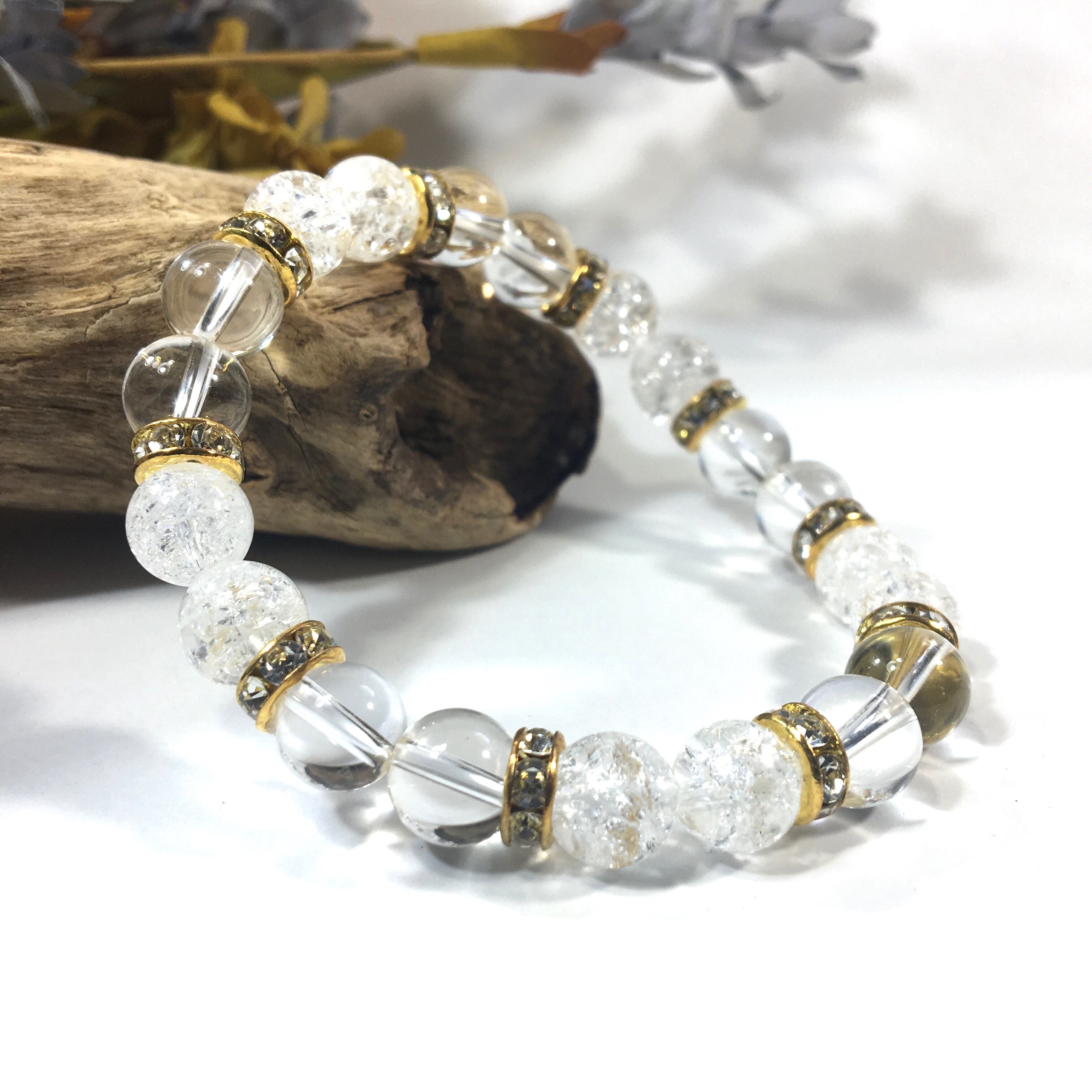 水晶&クラック水晶 パワーストーン ブレスレット 天然石 8mm(ゴールド)レディース 女性 数珠ブレス 開運 プレゼント ギフト