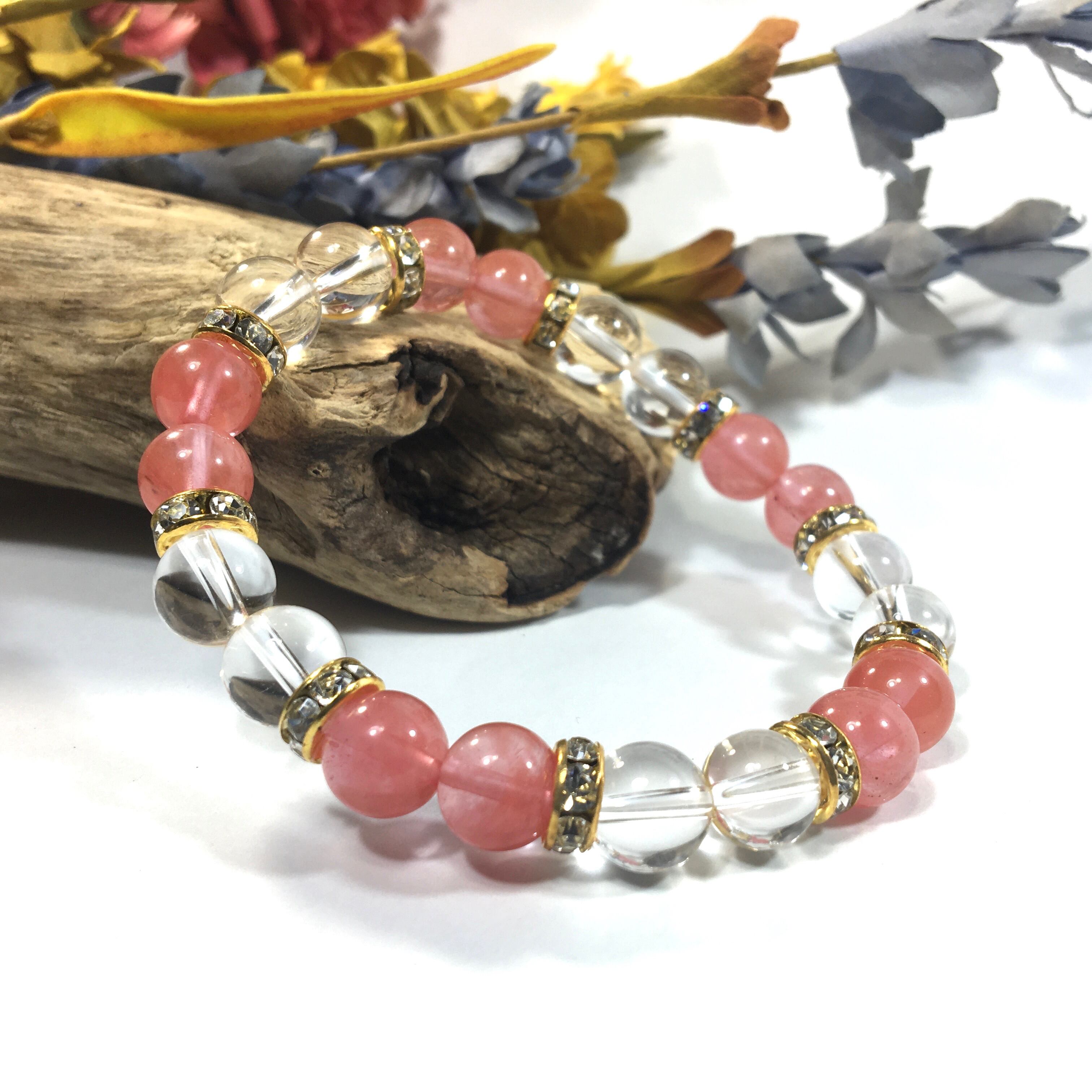水晶&チェリークォーツ パワーストーン ブレスレット 天然石ブレスレット 8mm(ゴールド)レディース 女性 数珠ブレス 開運 プレゼント ギフト