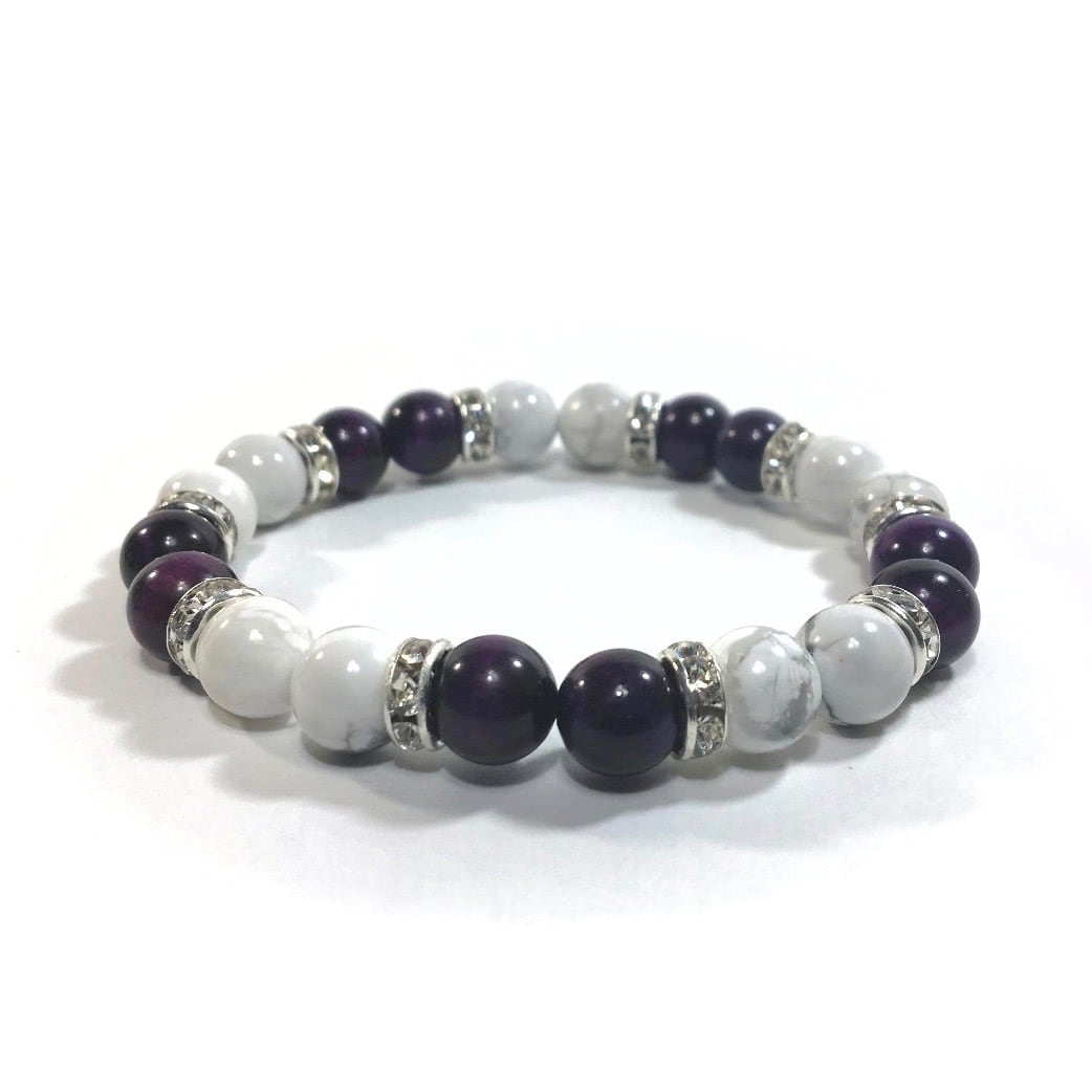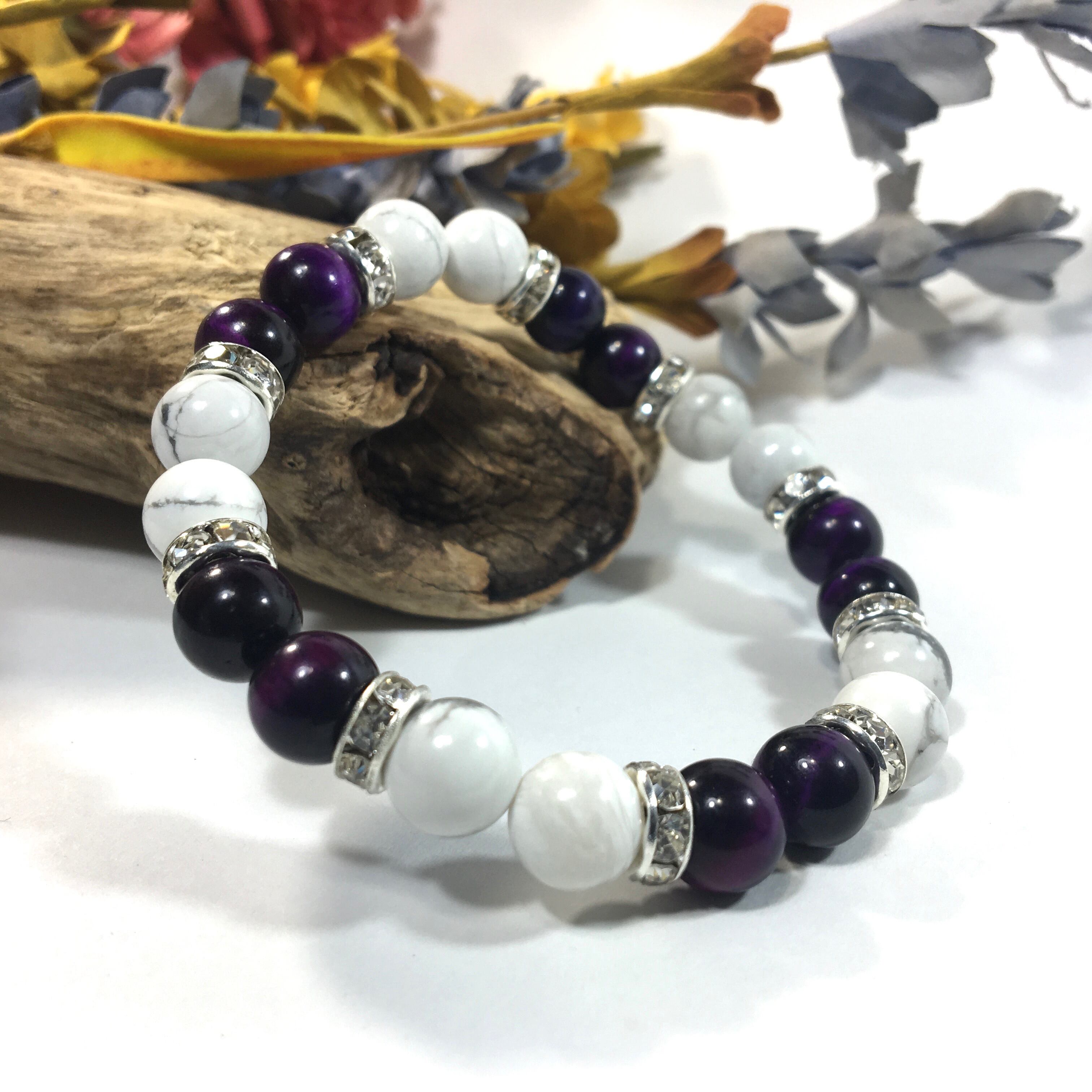 こちらは、8mm玉のハウライトとパープルタイガーアイを使ったパワーストーンブレスレットです。シンプルなデザインでどんなコーディネートにも合わせやすいデザインに仕上げています。サイズは内周約15cmです。気になる方は是非この機会にどうぞ。