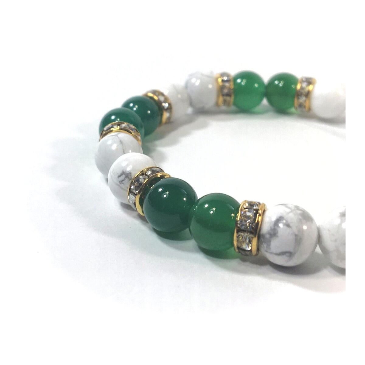 こちらは、8mm玉のハウライトと緑瑪瑙を使ったパワーストーンブレスレットです。シンプルなデザインでどんなコーディネートにも合わせやすいデザインに仕上げています。サイズは内周約15cmです。気になる方は是非この機会にどうぞ。