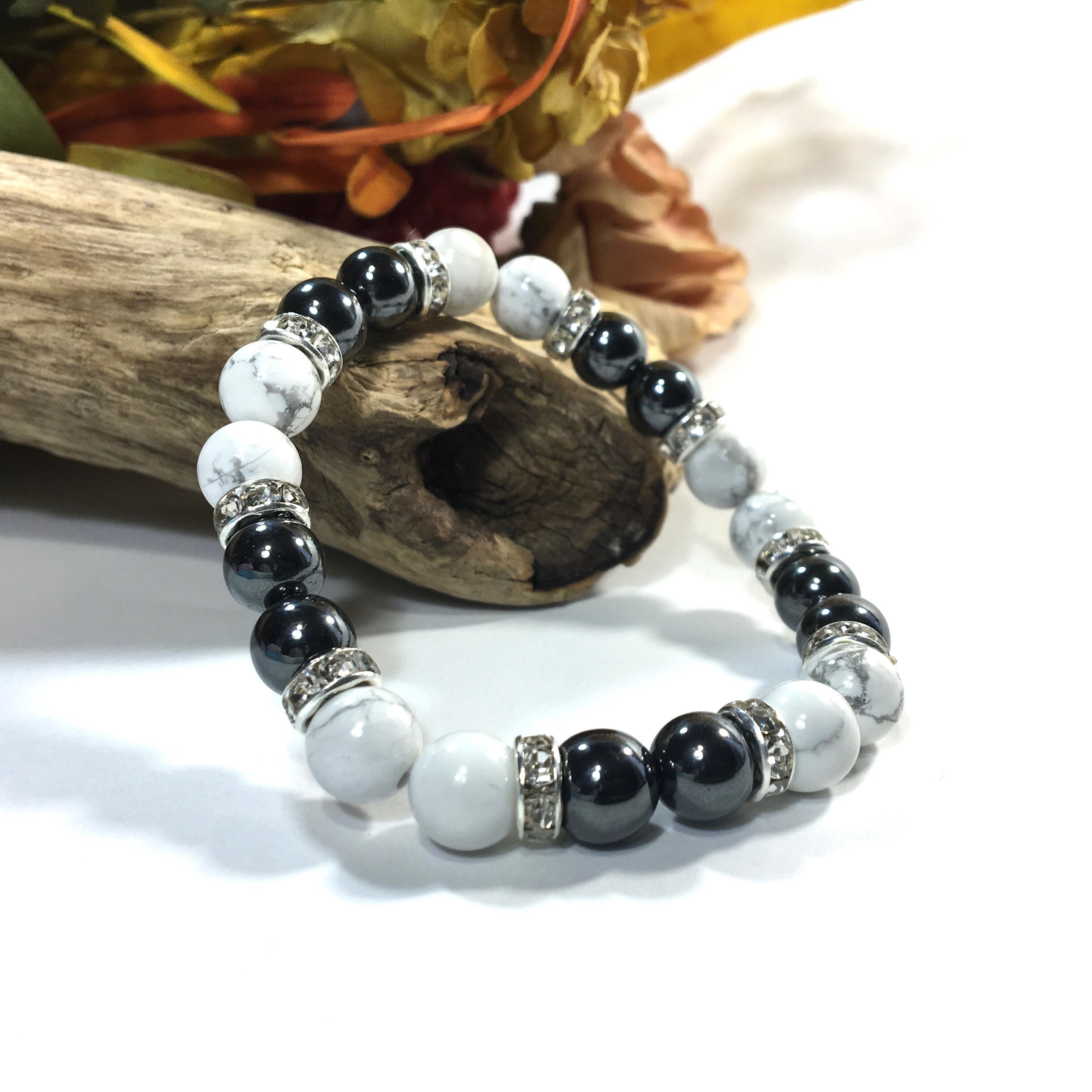 こちらは、8mm玉のハウライトとヘマタイトを使ったパワーストーンブレスレットです。シンプルなデザインでどんなコーディネートにも合わせやすいデザインに仕上げています。サイズは内周約15cmです。気になる方は是非この機会にどうぞ。
