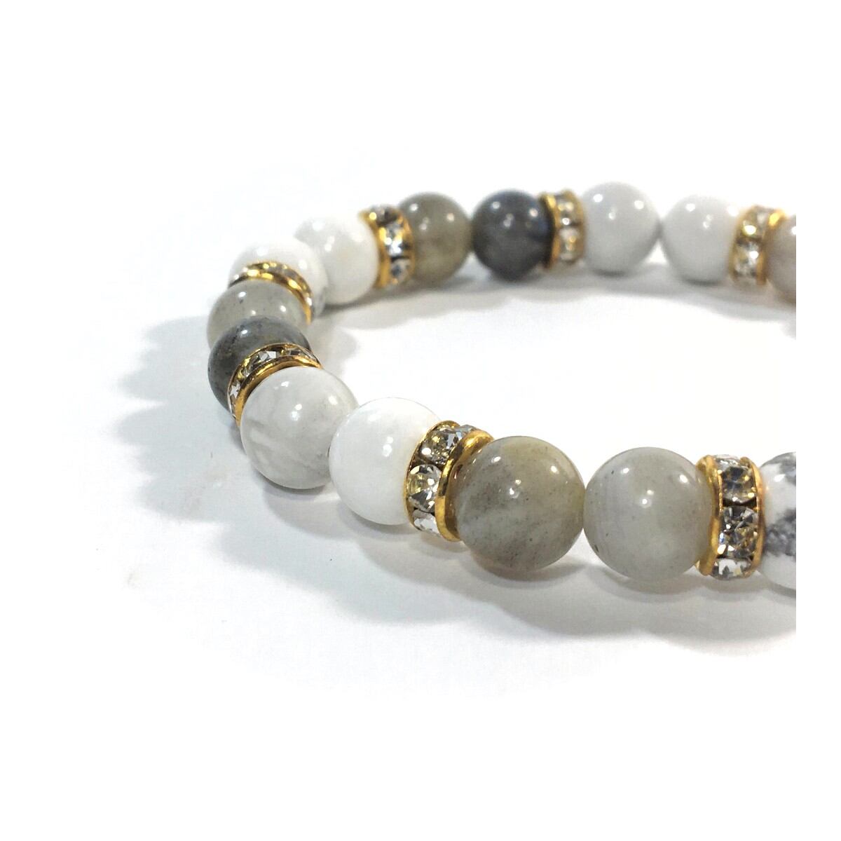 こちらは、8mm玉のハウライトとラブラドライトを使ったパワーストーンブレスレットです。シンプルなデザインでどんなコーディネートにも合わせやすいデザインに仕上げています。サイズは内周約15cmです。気になる方は是非この機会にどうぞ。
