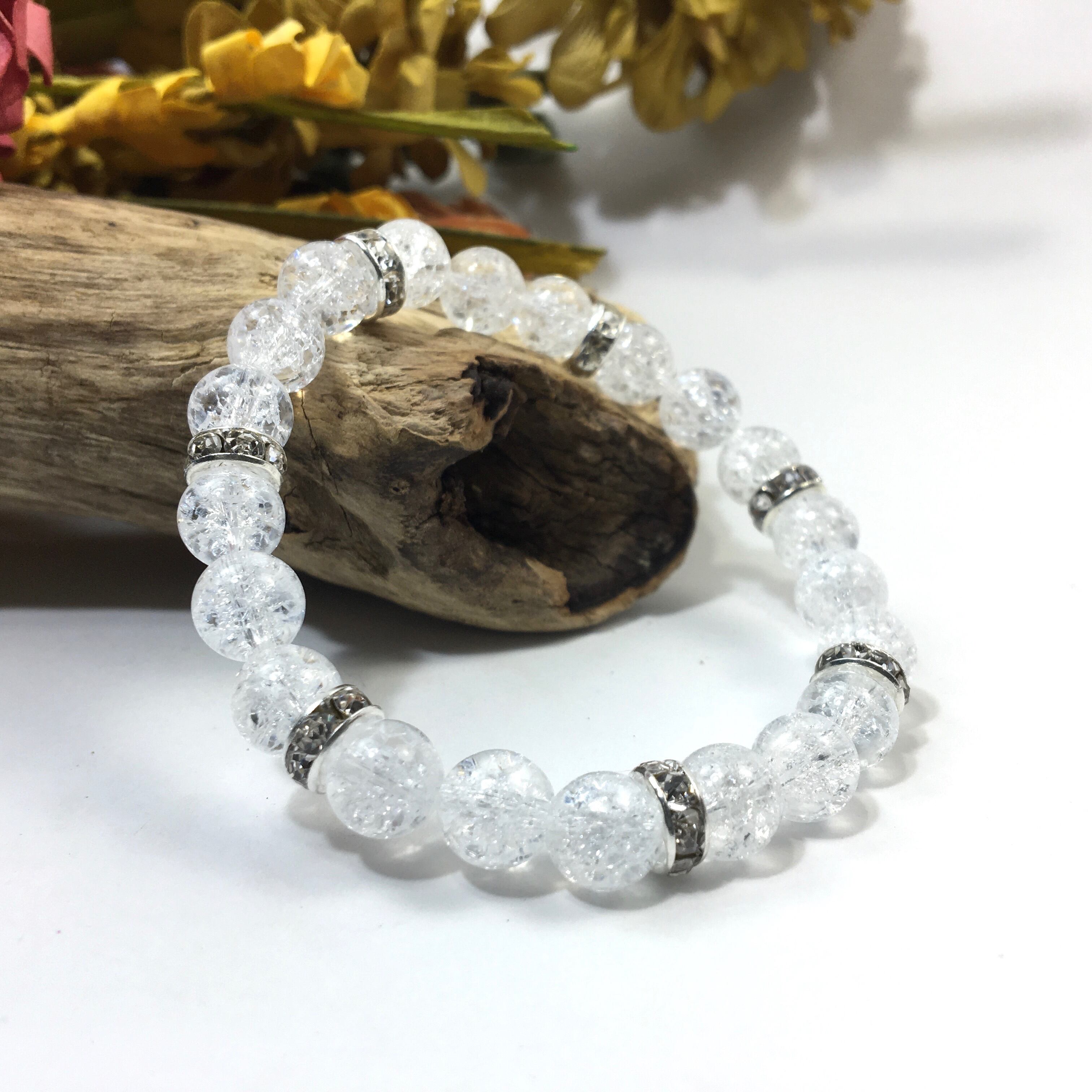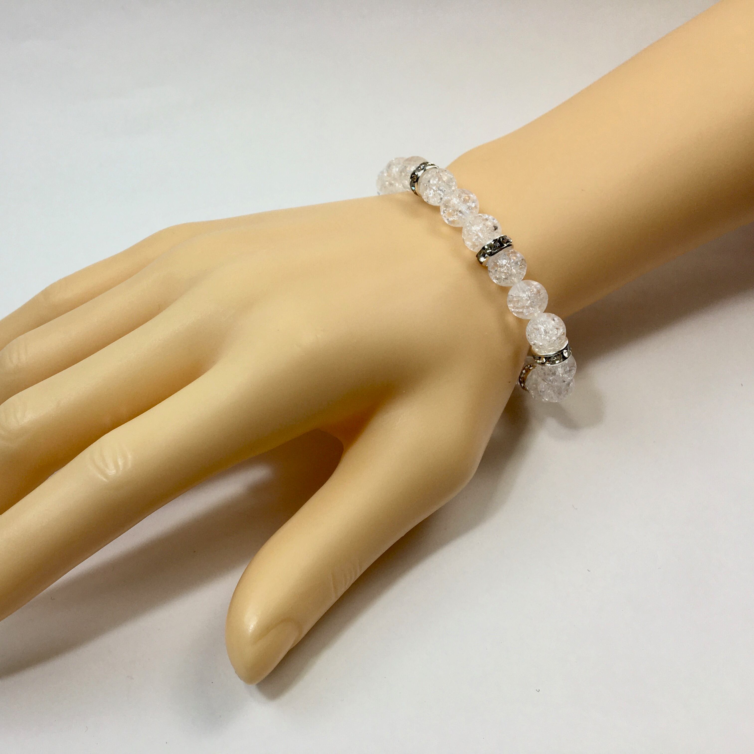 こちらは、8mm玉のクラック水晶を使ったパワーストーンブレスレットです。シンプルなデザインでどんなコーディネートにも合わせやすいデザインに仕上げています。サイズは内周約15cmです。気になる方は是非この機会にどうぞ。