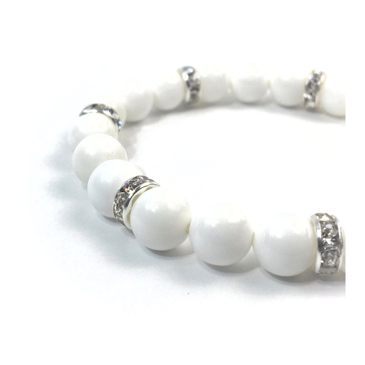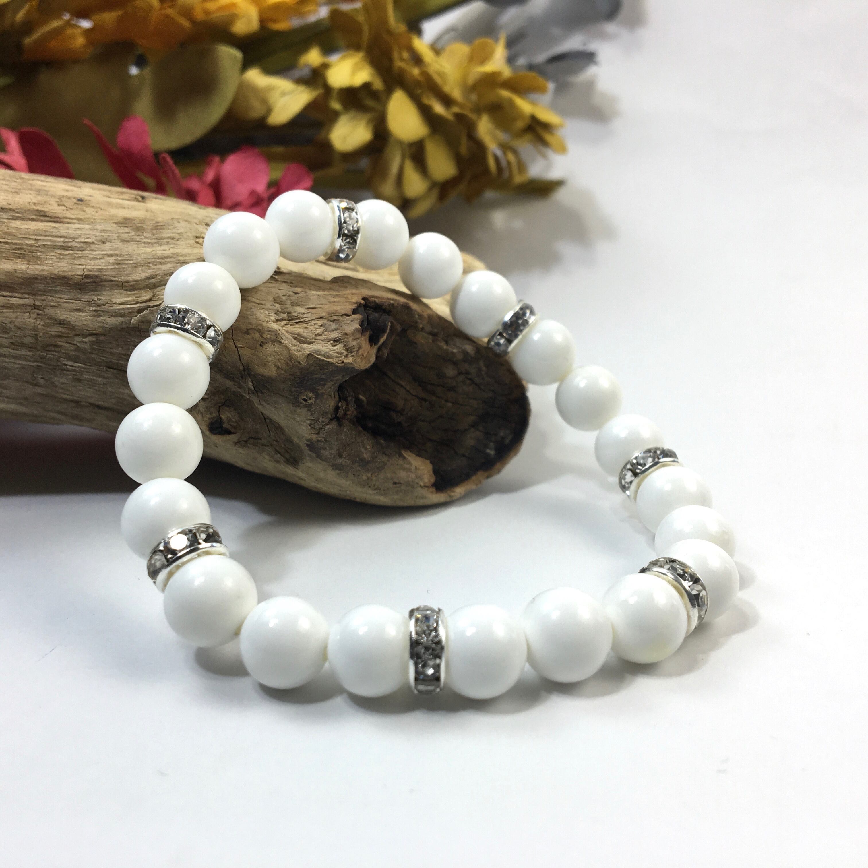 こちらは、8mm玉のホワイトオニキスを使ったパワーストーンブレスレットです。シンプルなデザインでどんなコーディネートにも合わせやすいデザインに仕上げています。サイズは内周約15cmです。気になる方は是非この機会にどうぞ。