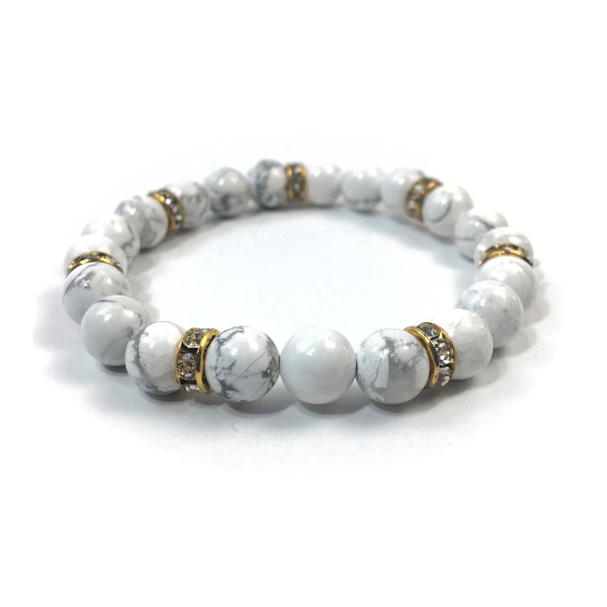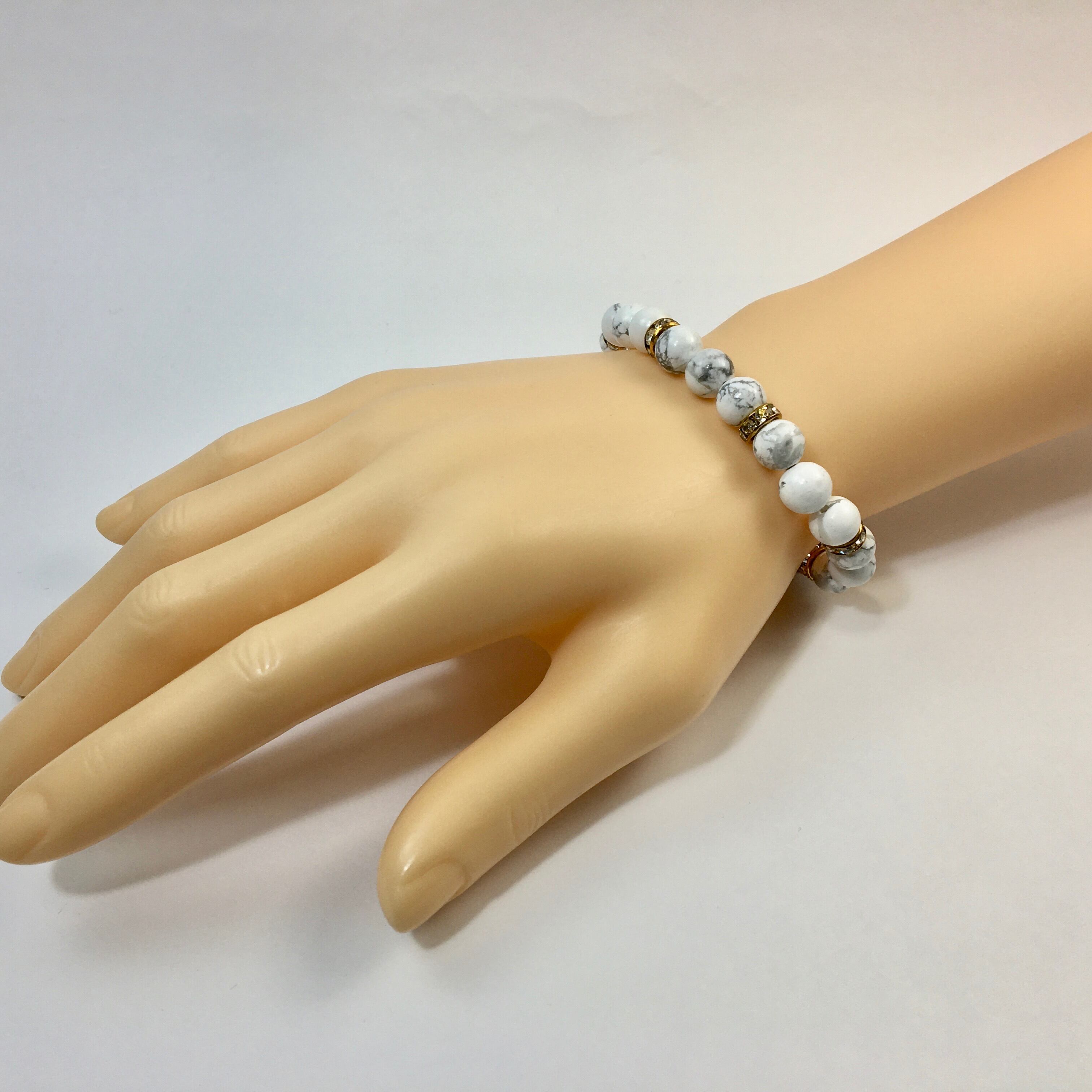 こちらは、8mm玉のハウライトを使ったパワーストーンブレスレットです。シンプルなデザインでどんなコーディネートにも合わせやすいデザインに仕上げています。サイズは内周約15cmです。気になる方は是非この機会にどうぞ。