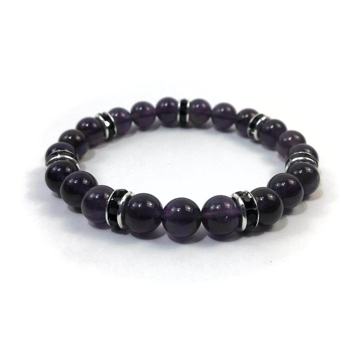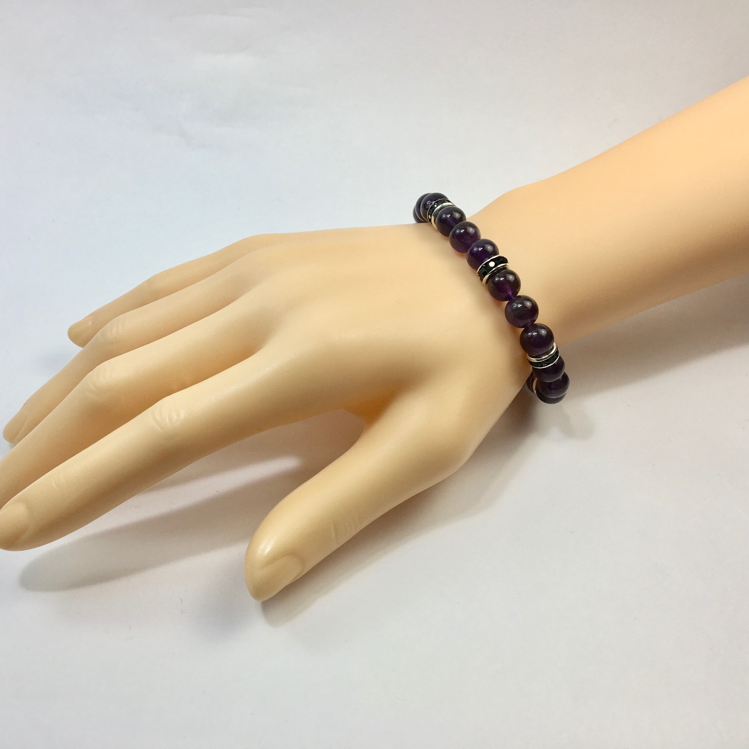 こちらは、8mm玉のアメジストを使ったパワーストーンブレスレットです。シンプルなデザインでどんなコーディネートにも合わせやすいデザインに仕上げています。サイズは内周約15cmです。気になる方は是非この機会にどうぞ。