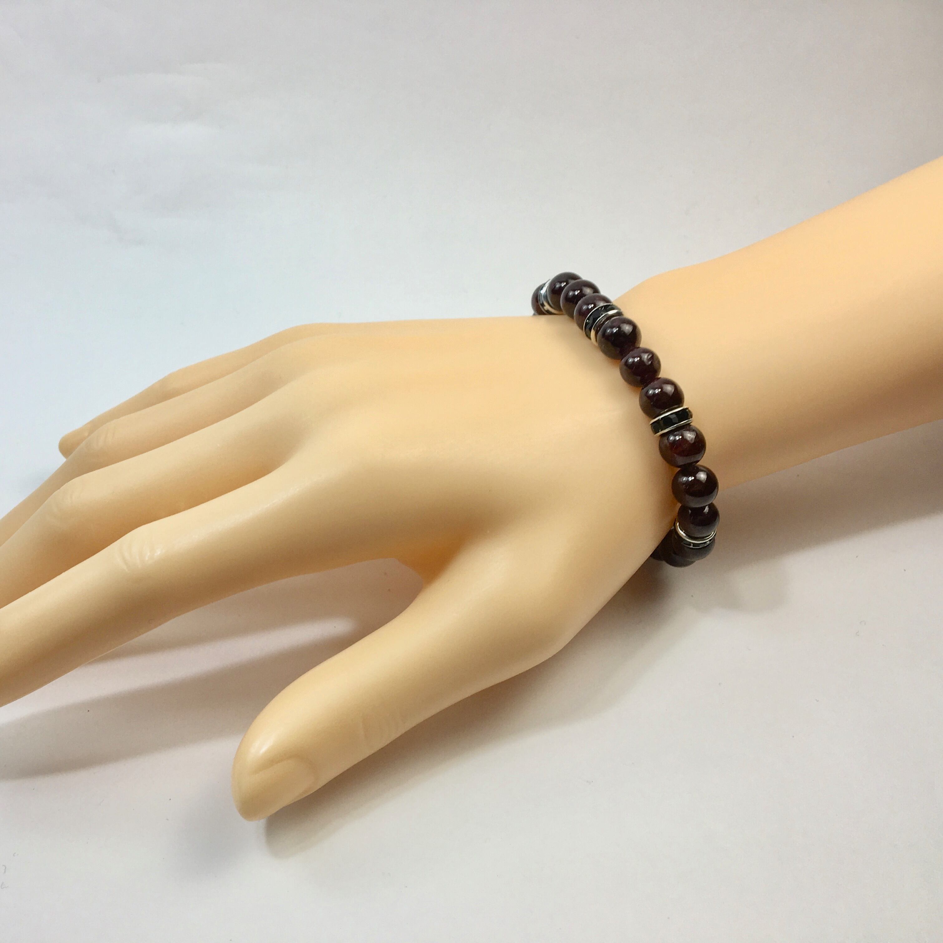 こちらは、8mm玉のガーネットを使ったパワーストーンブレスレットです。シンプルなデザインでどんなコーディネートにも合わせやすいデザインに仕上げています。サイズは内周約15cmです。気になる方は是非この機会にどうぞ。