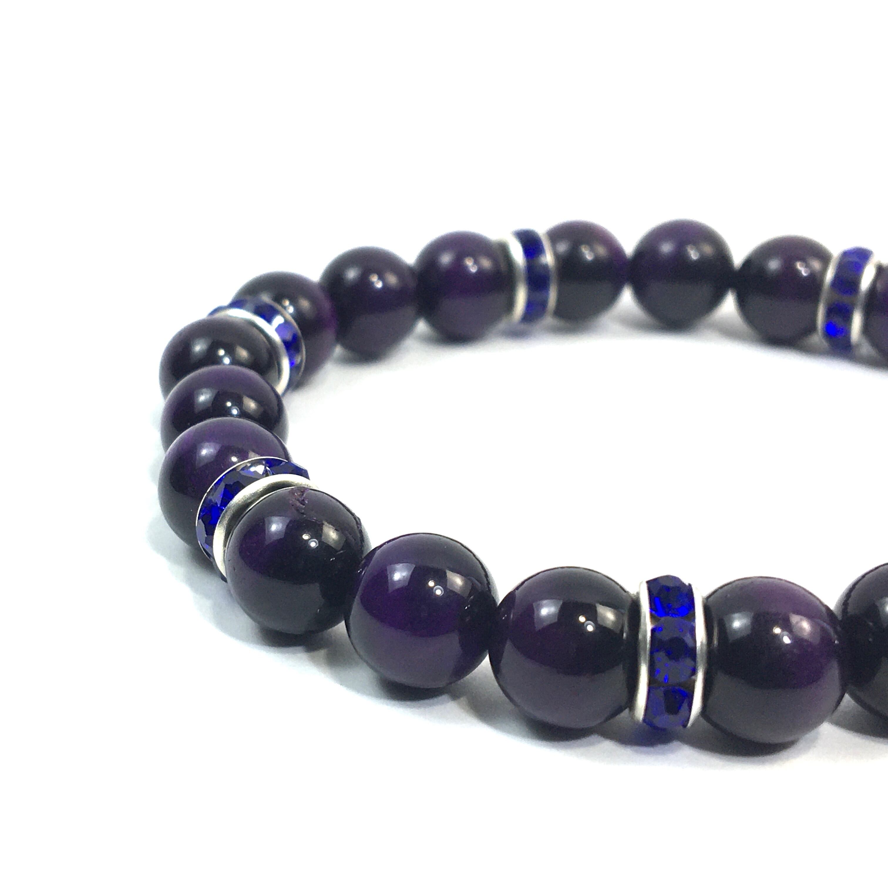 こちらは、8mm玉のパープルタイガーアイを使ったパワーストーンブレスレットです。シンプルなデザインでどんなコーディネートにも合わせやすいデザインに仕上げています。サイズは内周約15cmです。気になる方は是非この機会にどうぞ。