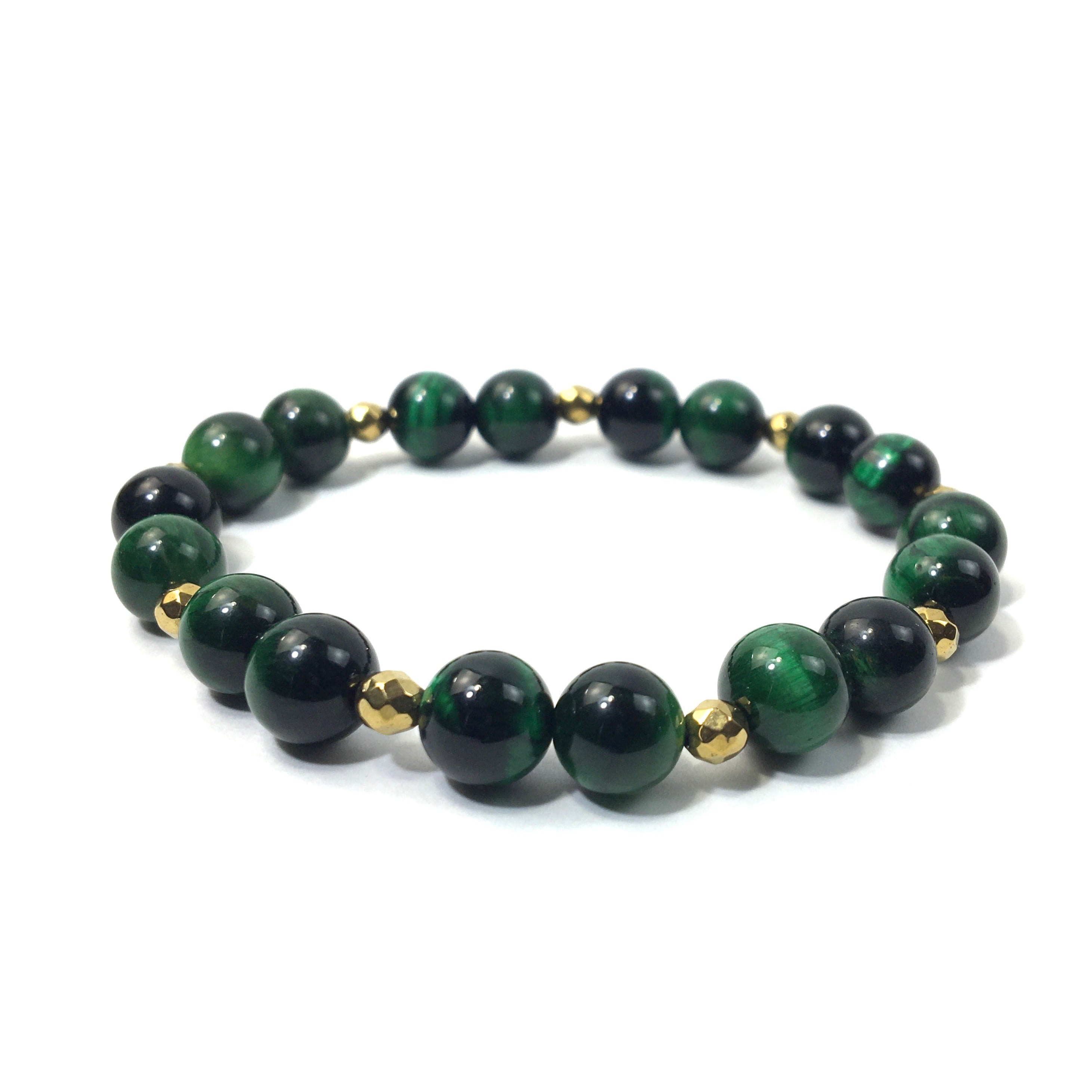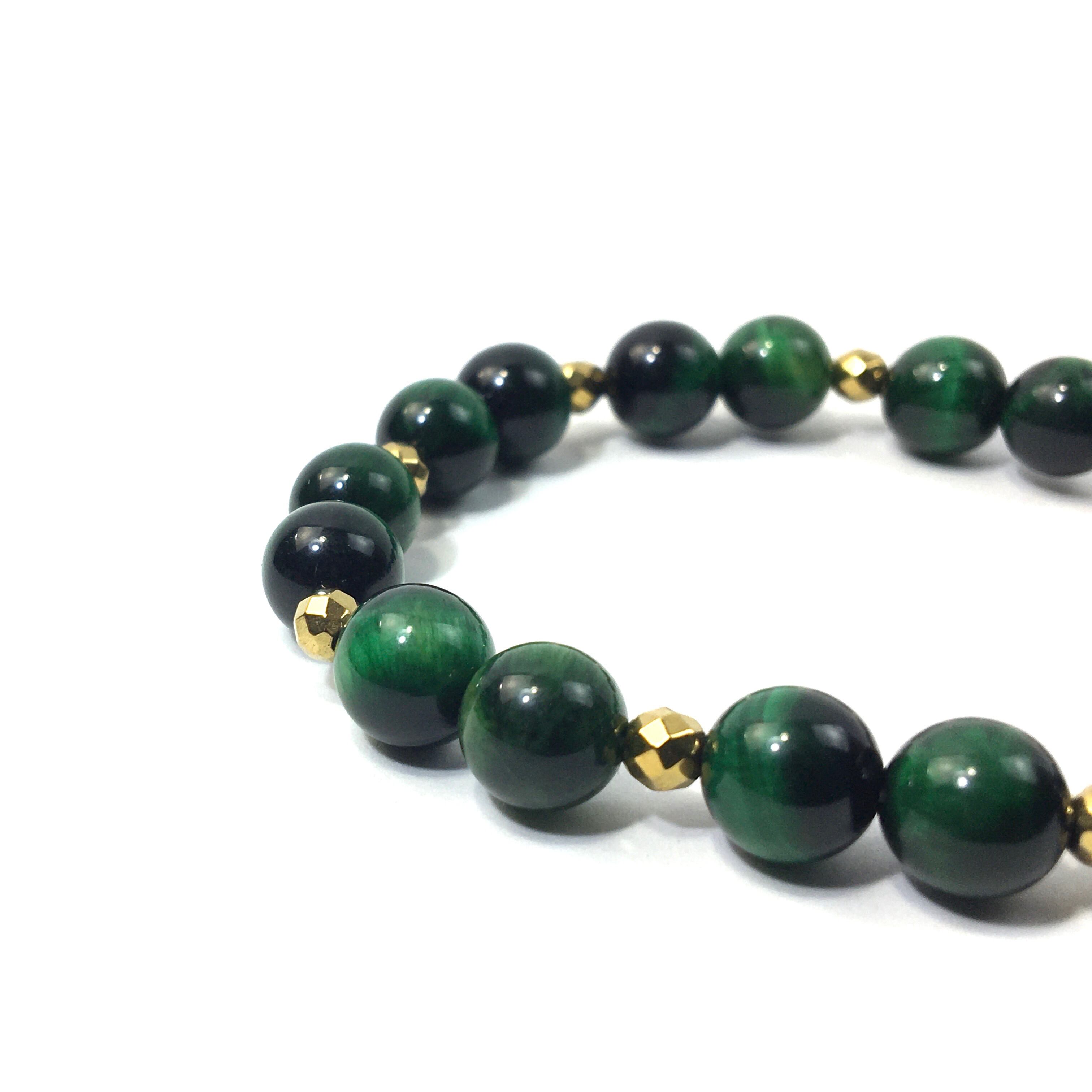 こちらは、8mm玉のグリーンタイガーアイを使ったパワーストーンブレスレットです。今回は石との間にはゴールドのヘマタイトを加えアクセントとしております。シンプルなデザインでどんなコーディネートにも合わせやすいデザインに仕上げています。サイズは内周約15cmです。気になる方は是非この機会にどうぞ。