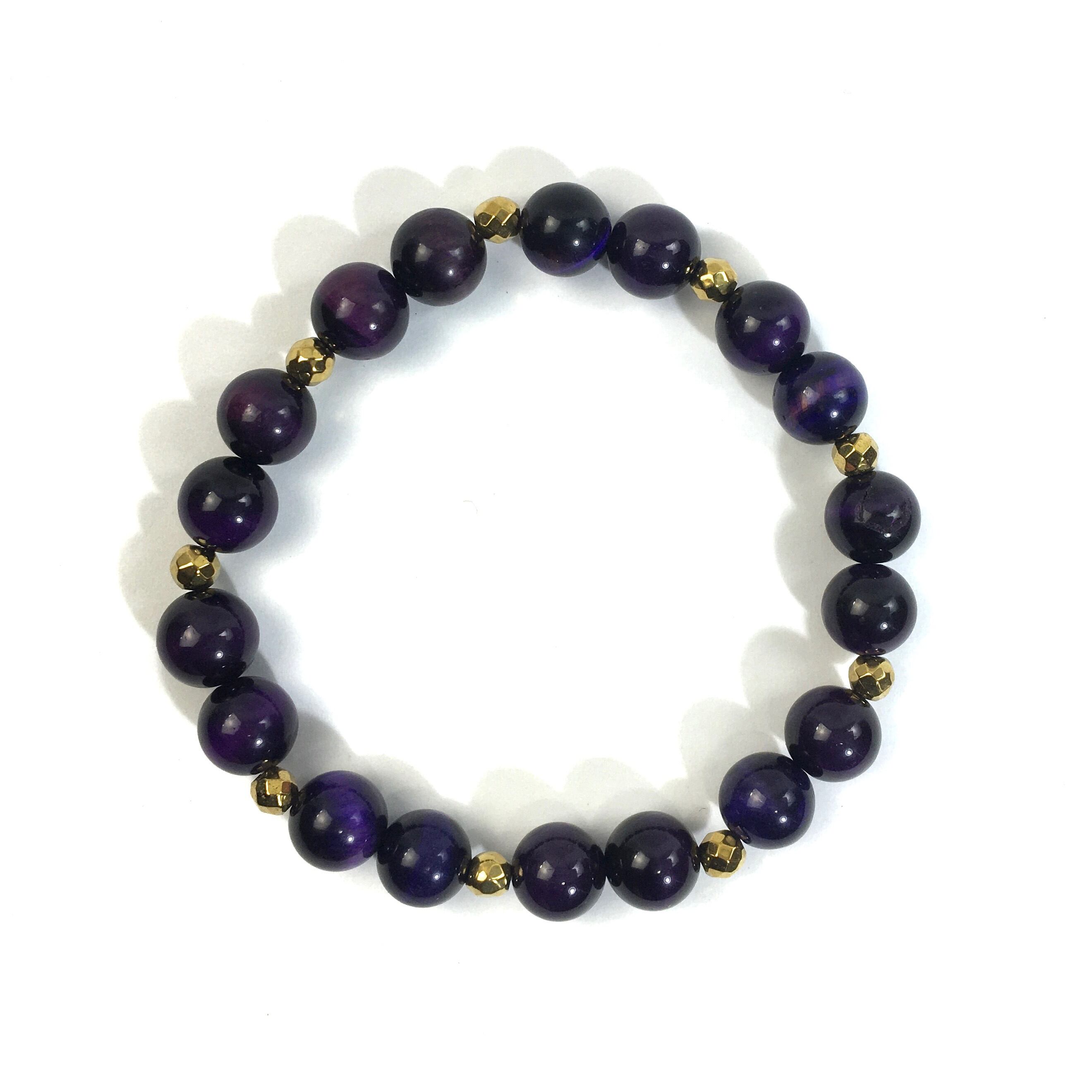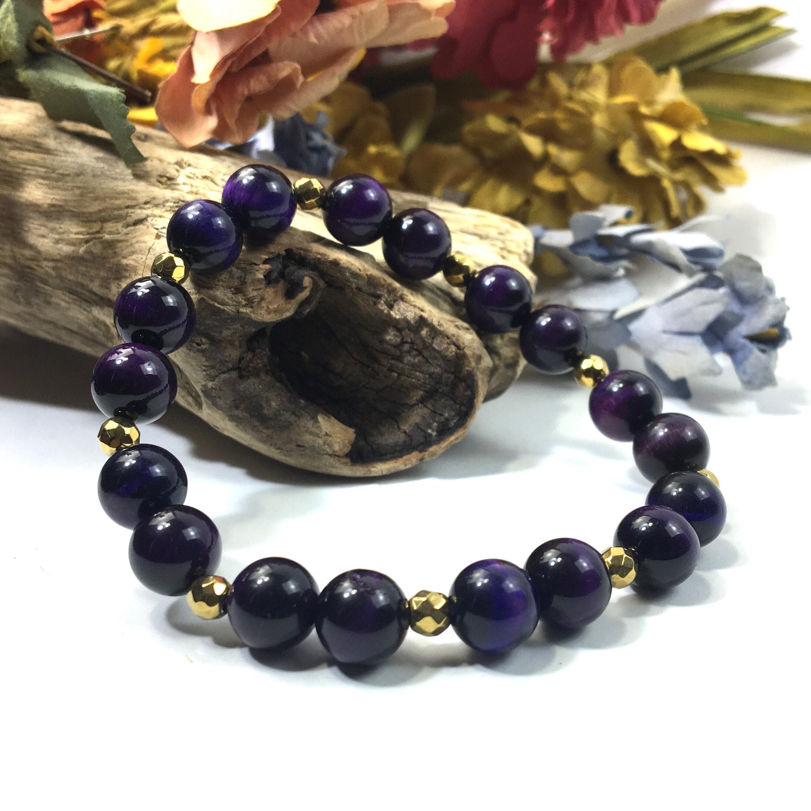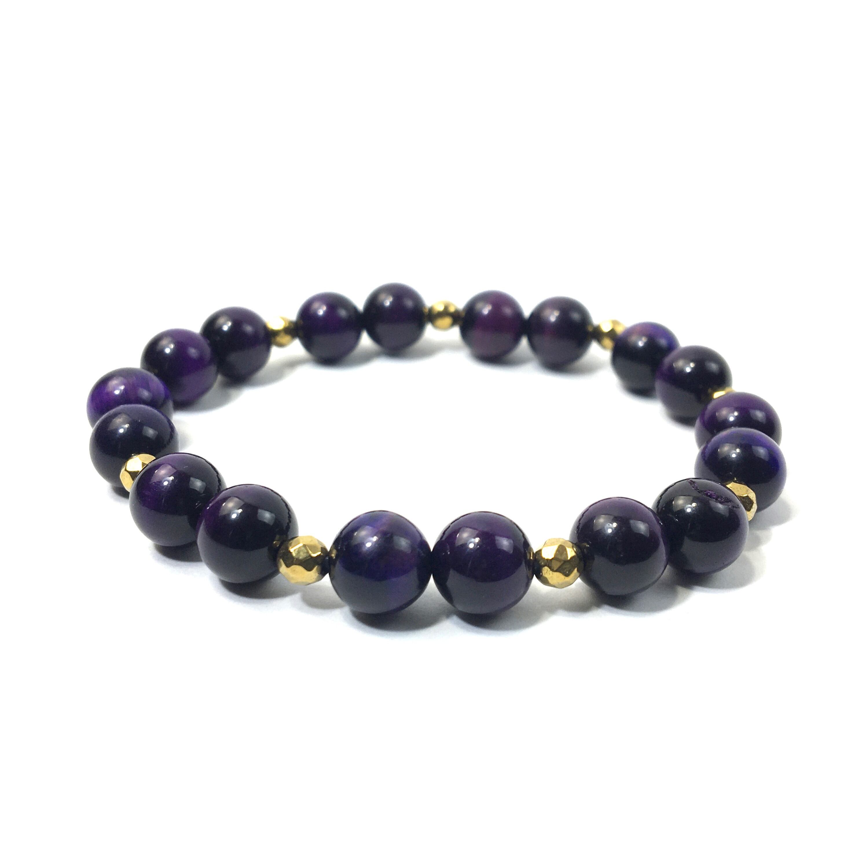 こちらは、8mm玉のパープルタイガーアイを使ったパワーストーンブレスレットです。今回は石との間にはゴールドのヘマタイトを加えアクセントとしております。シンプルなデザインでどんなコーディネートにも合わせやすいデザインに仕上げています。サイズは内周約15cmです。気になる方は是非この機会にどうぞ。