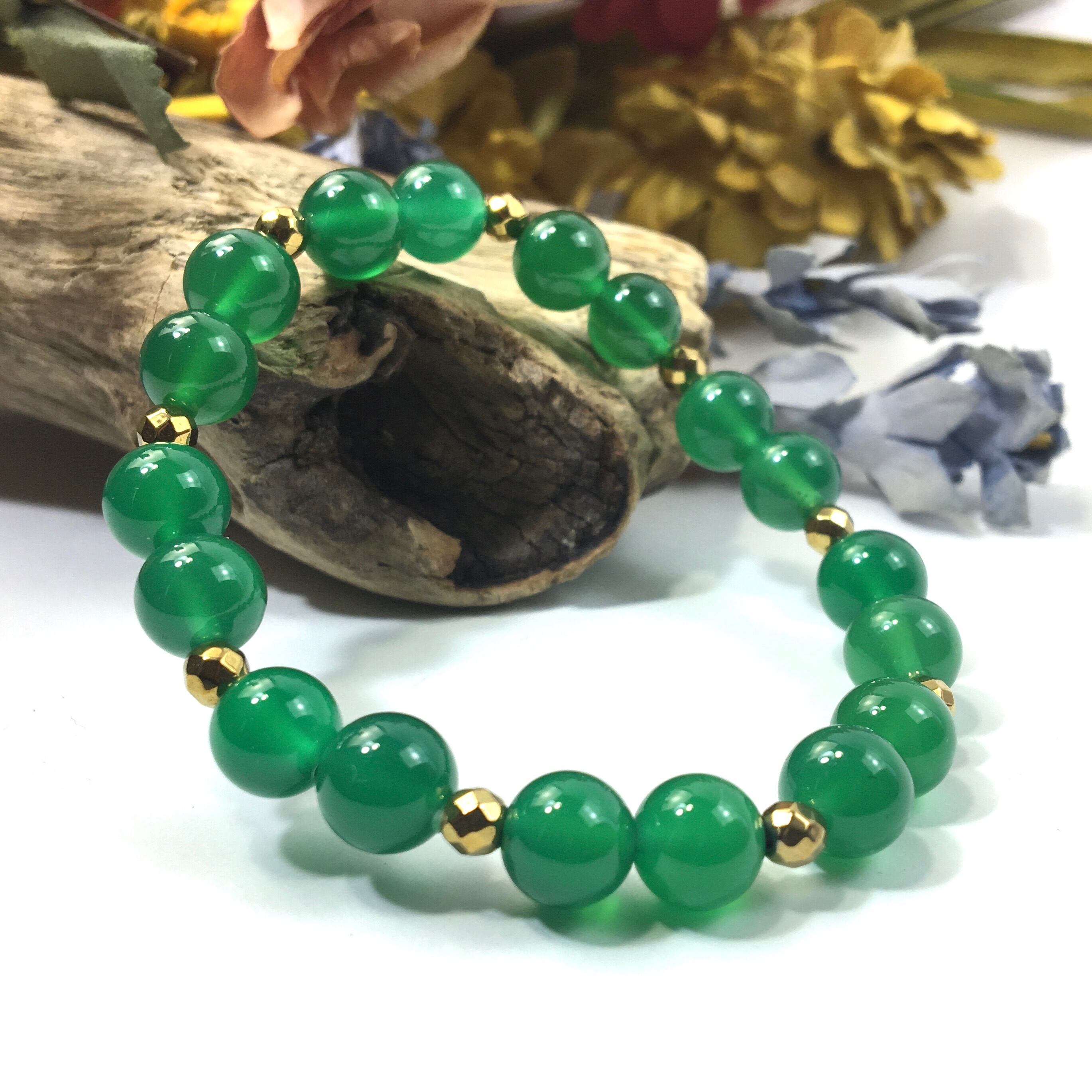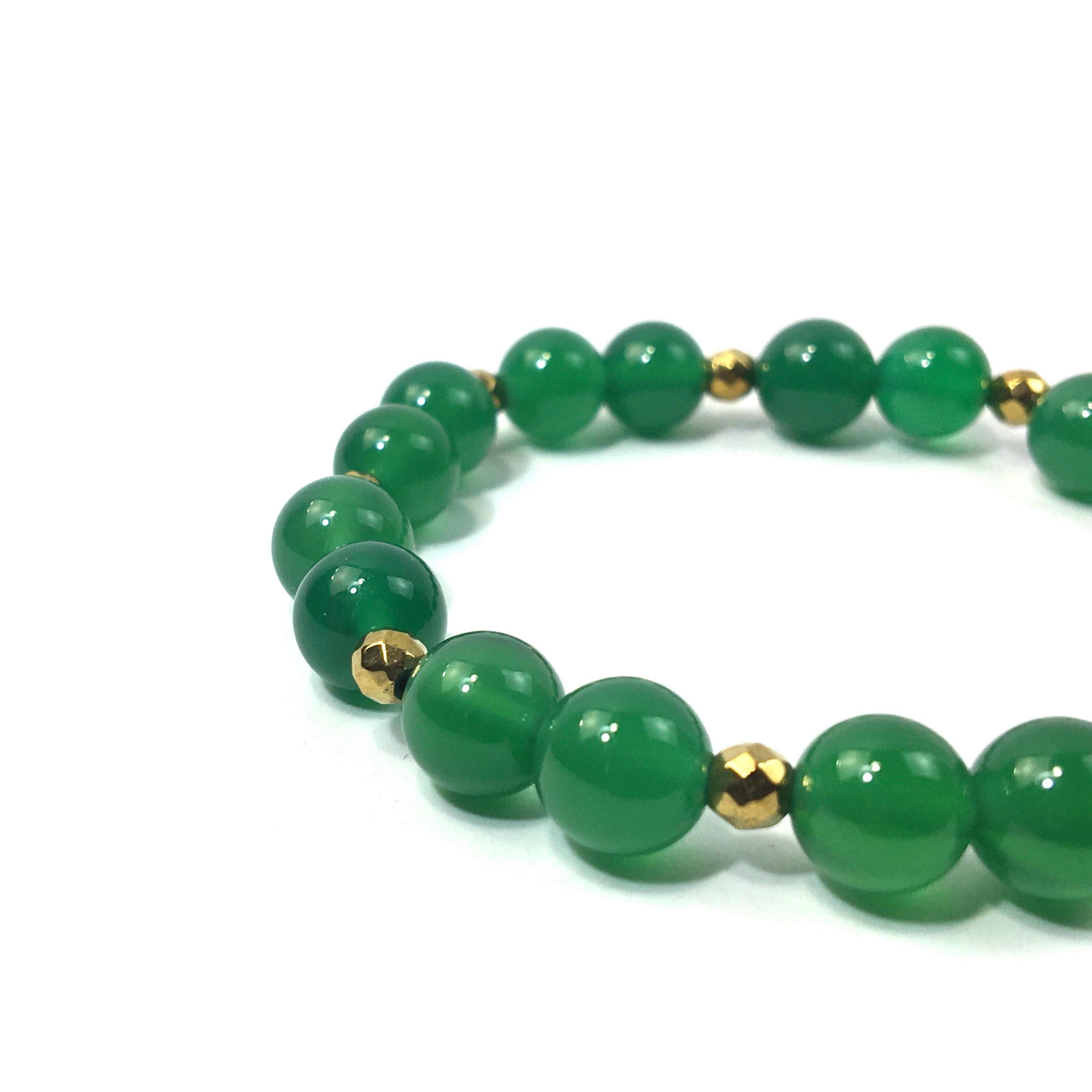 こちらは、8mm玉の緑瑪瑙を使ったパワーストーンブレスレットです。今回は石との間にはゴールドのヘマタイトを加えアクセントとしております。シンプルなデザインでどんなコーディネートにも合わせやすいデザインに仕上げています。サイズは内周約15cmです。気になる方は是非この機会にどうぞ。