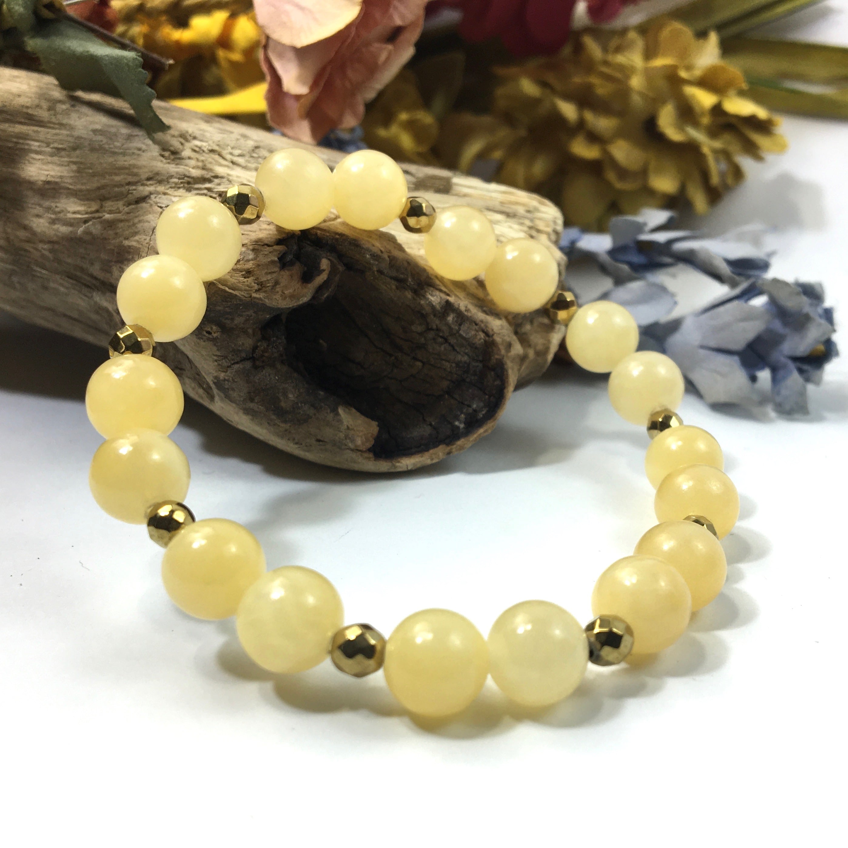 こちらは、8mm玉のアラゴナイトを使ったパワーストーンブレスレットです。今回は石との間にはゴールドのヘマタイトを加えアクセントとしております。シンプルなデザインでどんなコーディネートにも合わせやすいデザインに仕上げています。サイズは内周約15cmです。気になる方は是非この機会にどうぞ。