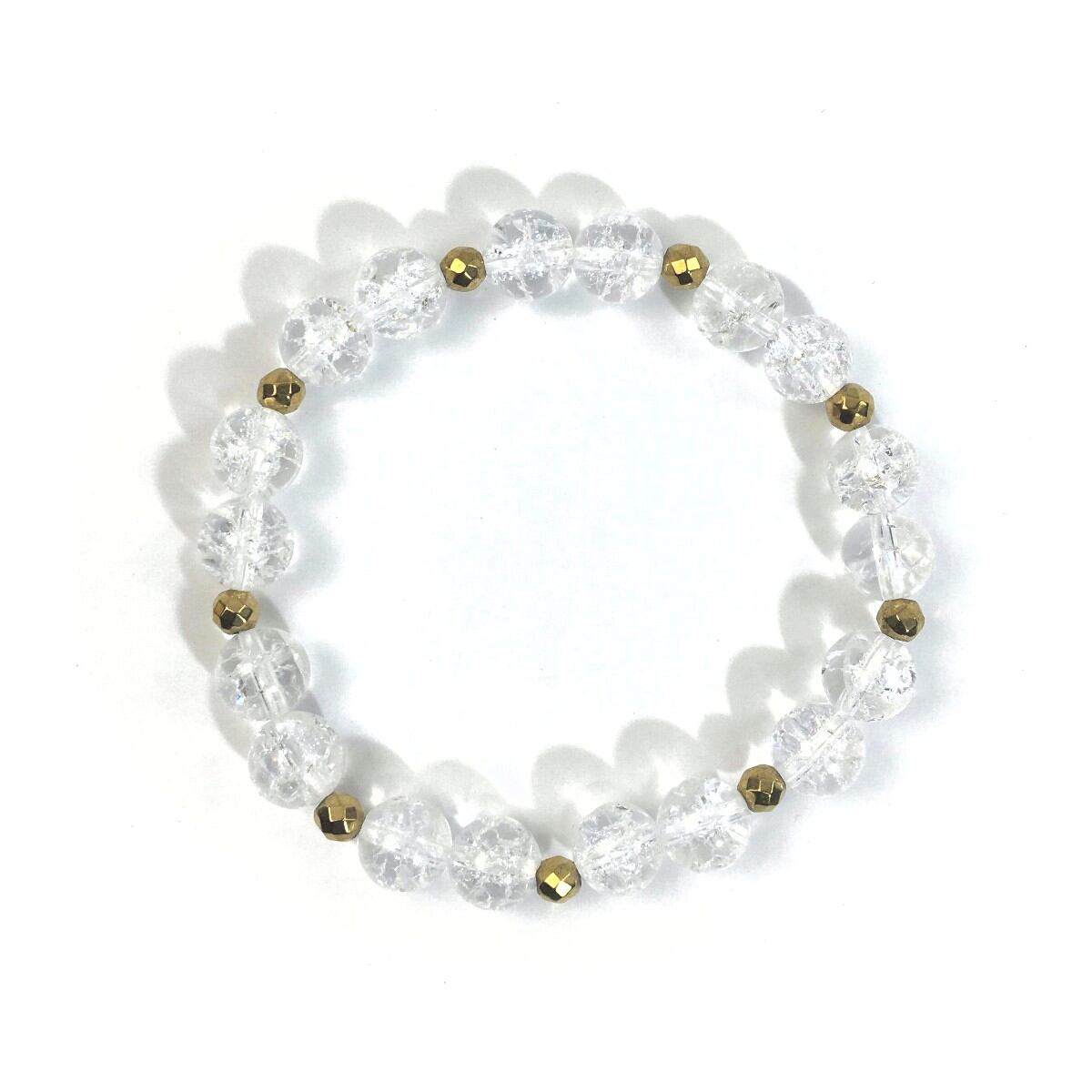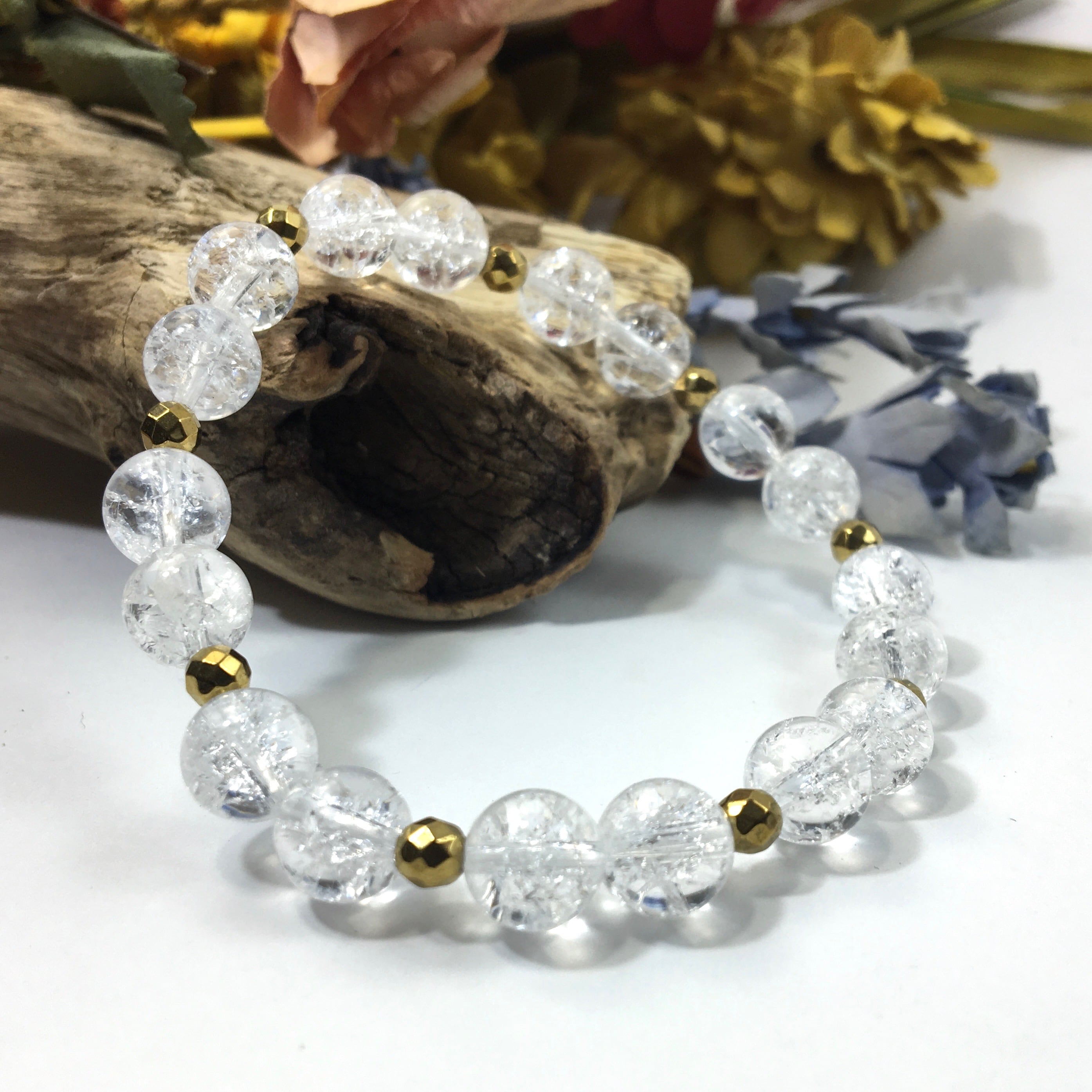 こちらは、8mm玉のクラック水晶を使ったパワーストーンブレスレットです。今回は石との間にはゴールドのヘマタイトを加えアクセントとしております。シンプルなデザインでどんなコーディネートにも合わせやすいデザインに仕上げています。サイズは内周約15cmです。気になる方は是非この機会にどうぞ。