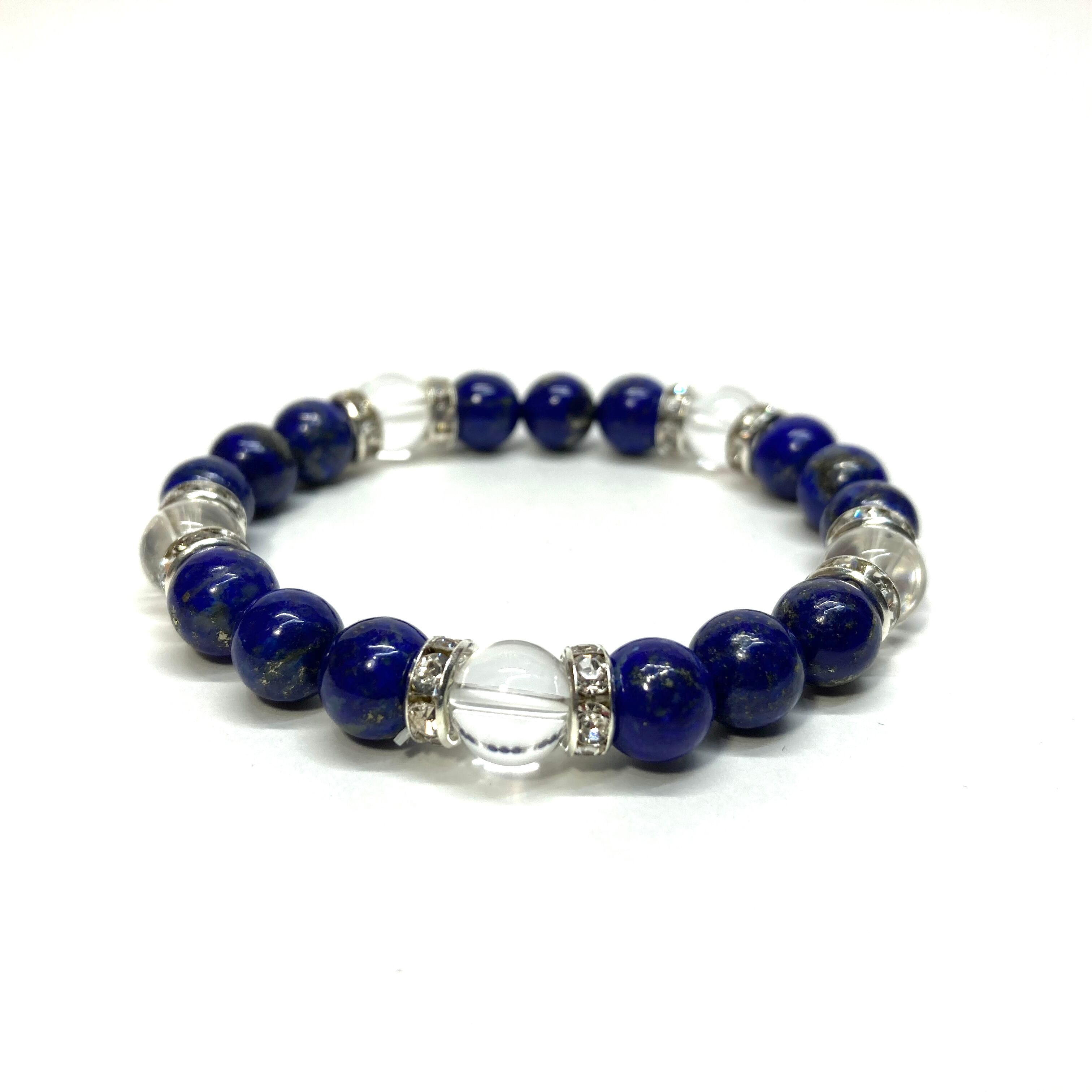 こちらは、8mm玉のラピスラズリと水晶を使ったパワーストーンブレスレットです。シンプルなデザインでどんなコーディネートにも合わせやすいデザインに仕上げています。サイズは内周約15cmです。気になる方は是非この機会にどうぞ。
