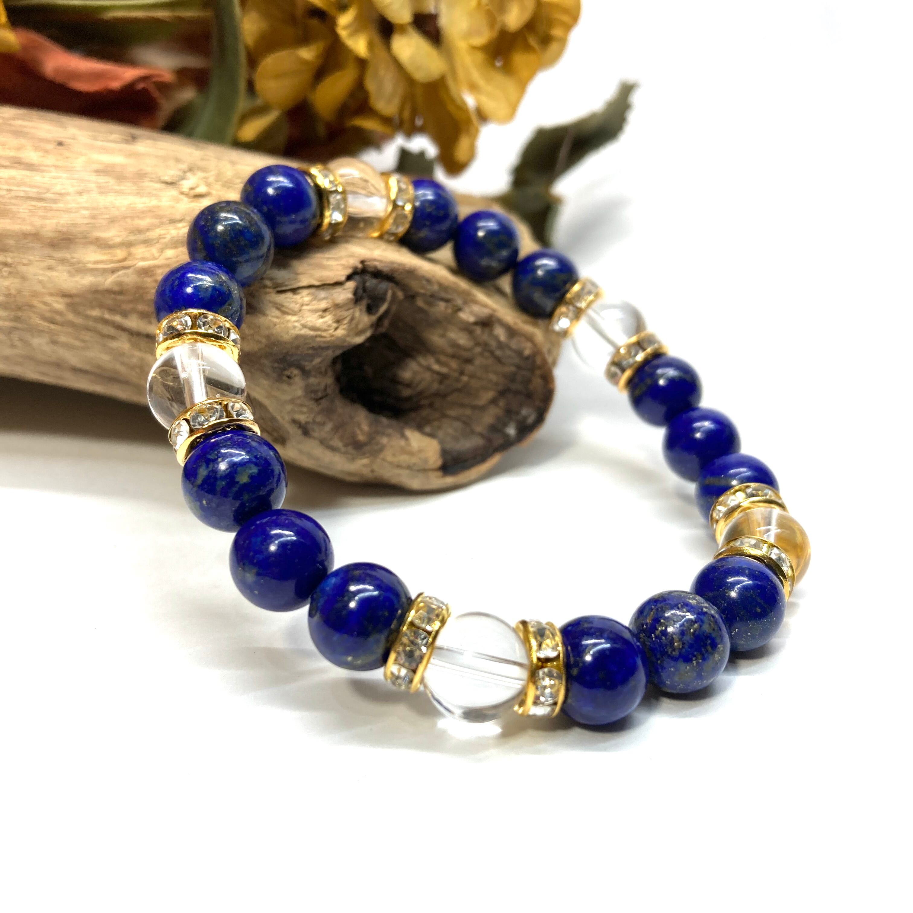 こちらは、8mm玉のラピスラズリと水晶を使ったパワーストーンブレスレットです。シンプルなデザインでどんなコーディネートにも合わせやすいデザインに仕上げています。サイズは内周約15cmです。気になる方は是非この機会にどうぞ。