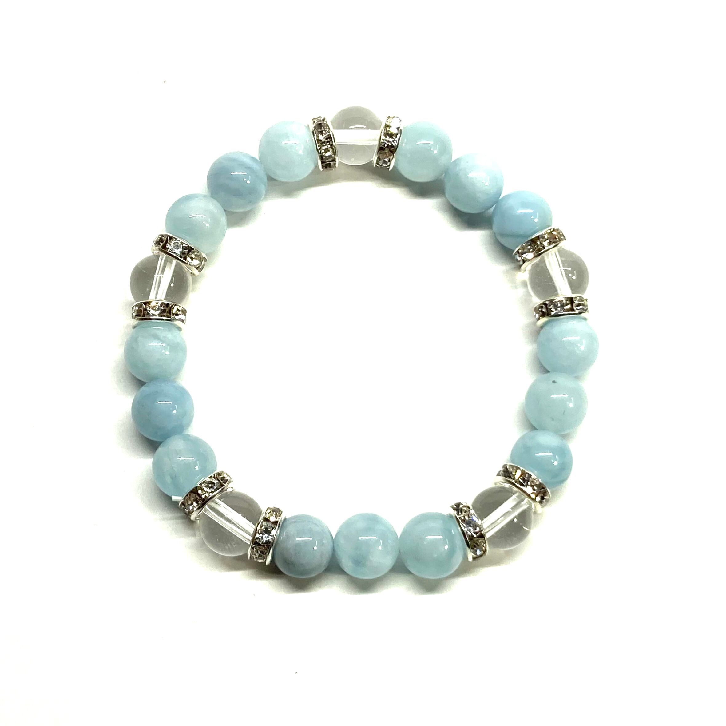 こちらは、8mm玉のアクアマリンと水晶を使ったパワーストーンブレスレットです。シンプルなデザインでどんなコーディネートにも合わせやすいデザインに仕上げています。サイズは内周約15cmです。気になる方は是非この機会にどうぞ。