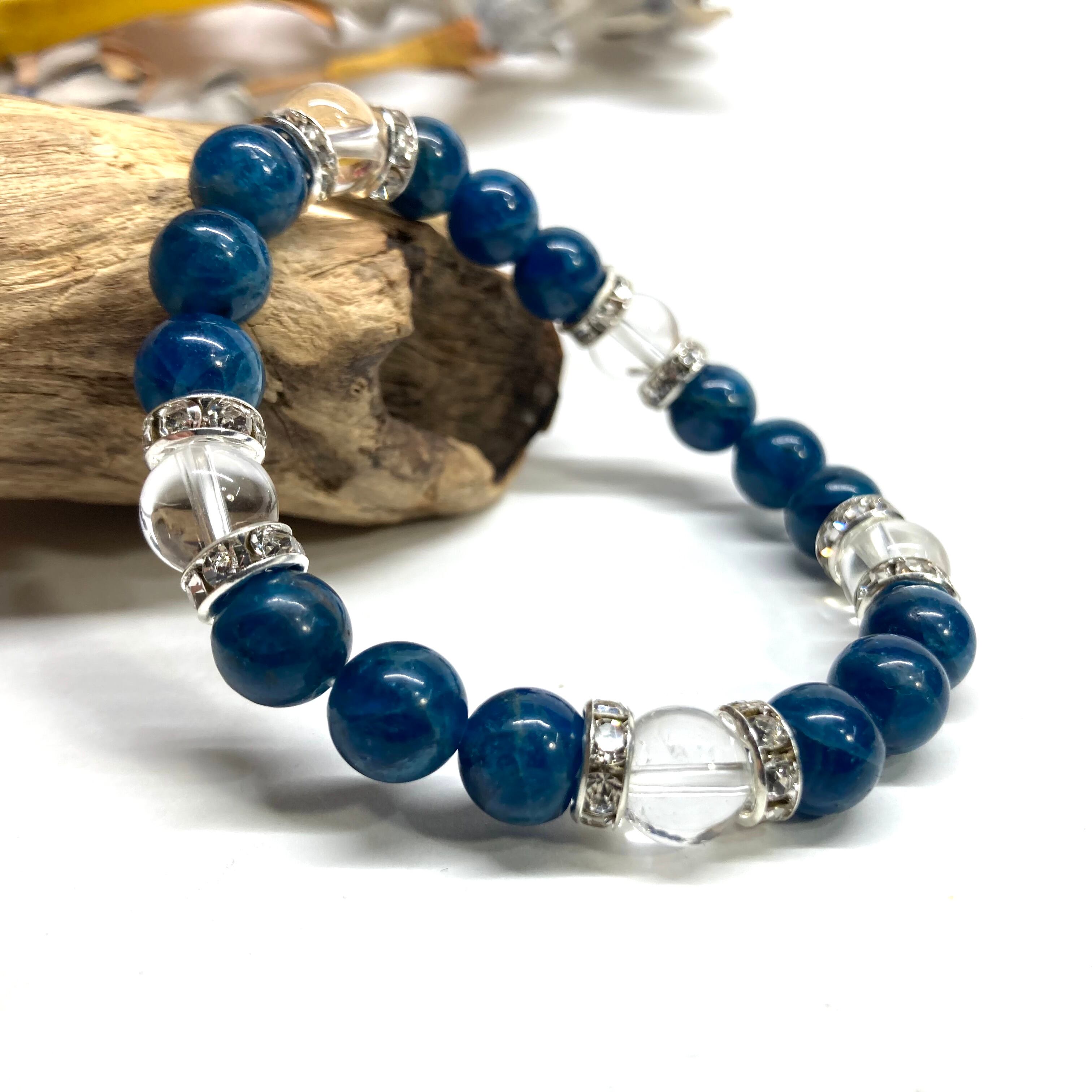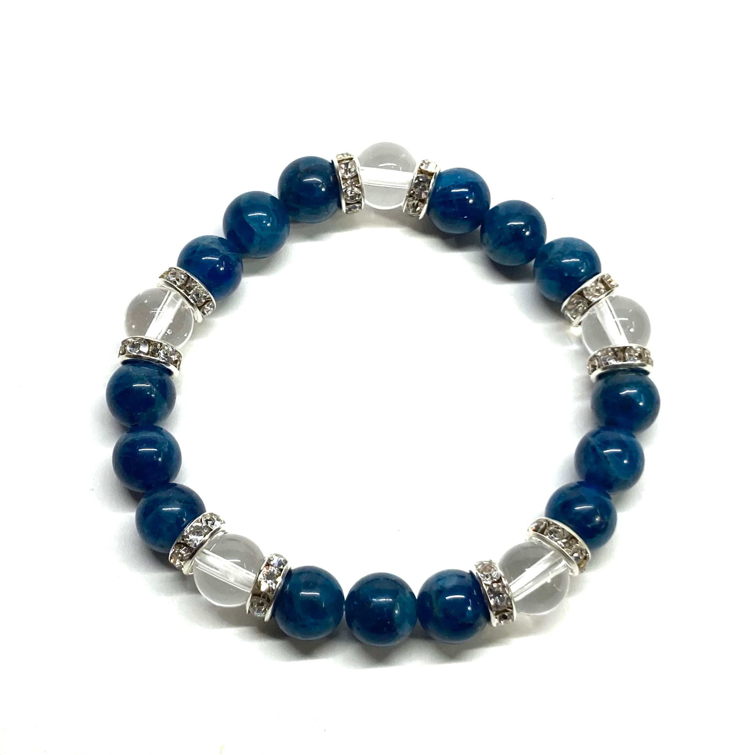 こちらは、8mm玉のアパタイトと水晶を使ったパワーストーンブレスレットです。シンプルなデザインでどんなコーディネートにも合わせやすいデザインに仕上げています。サイズは内周約15cmです。気になる方は是非この機会にどうぞ。