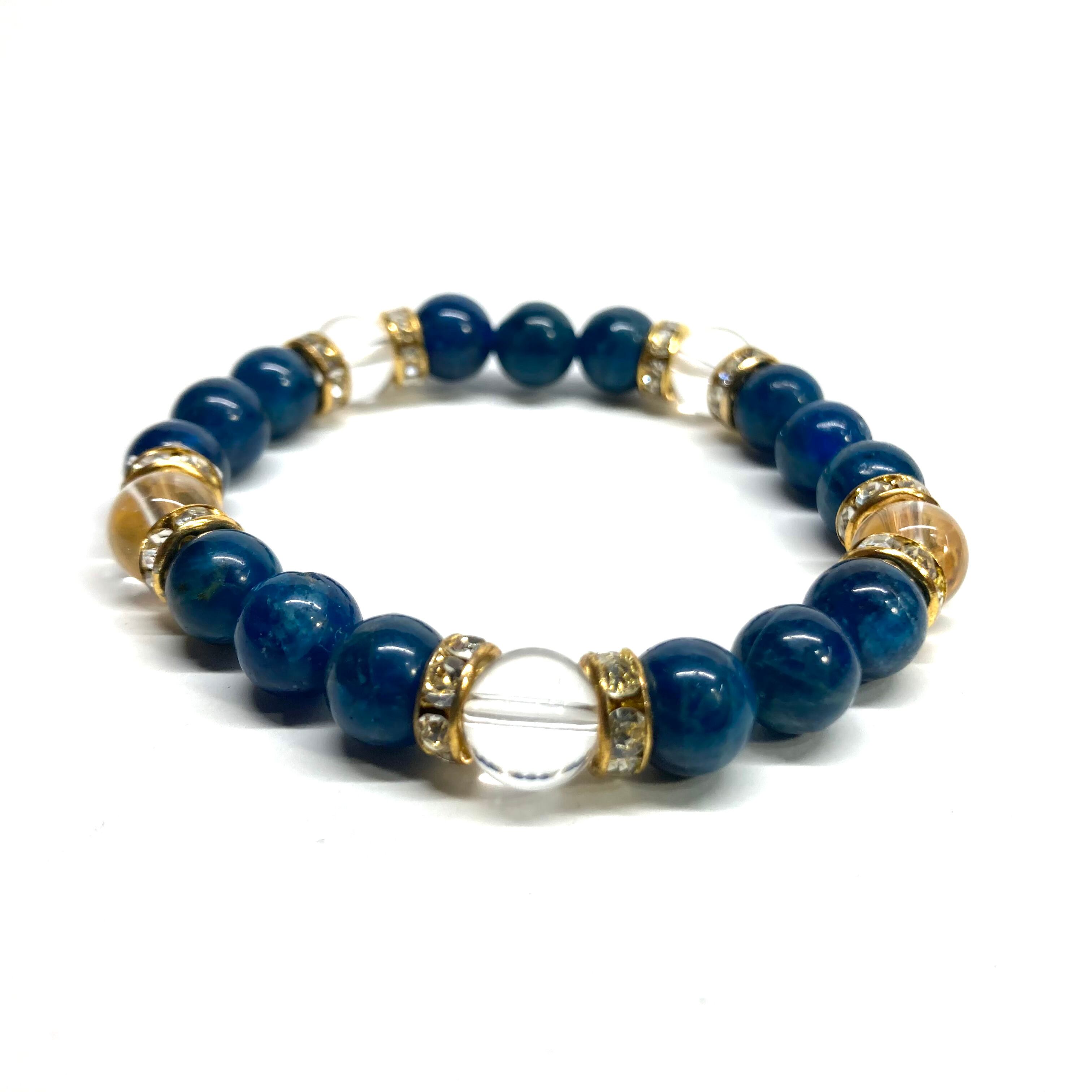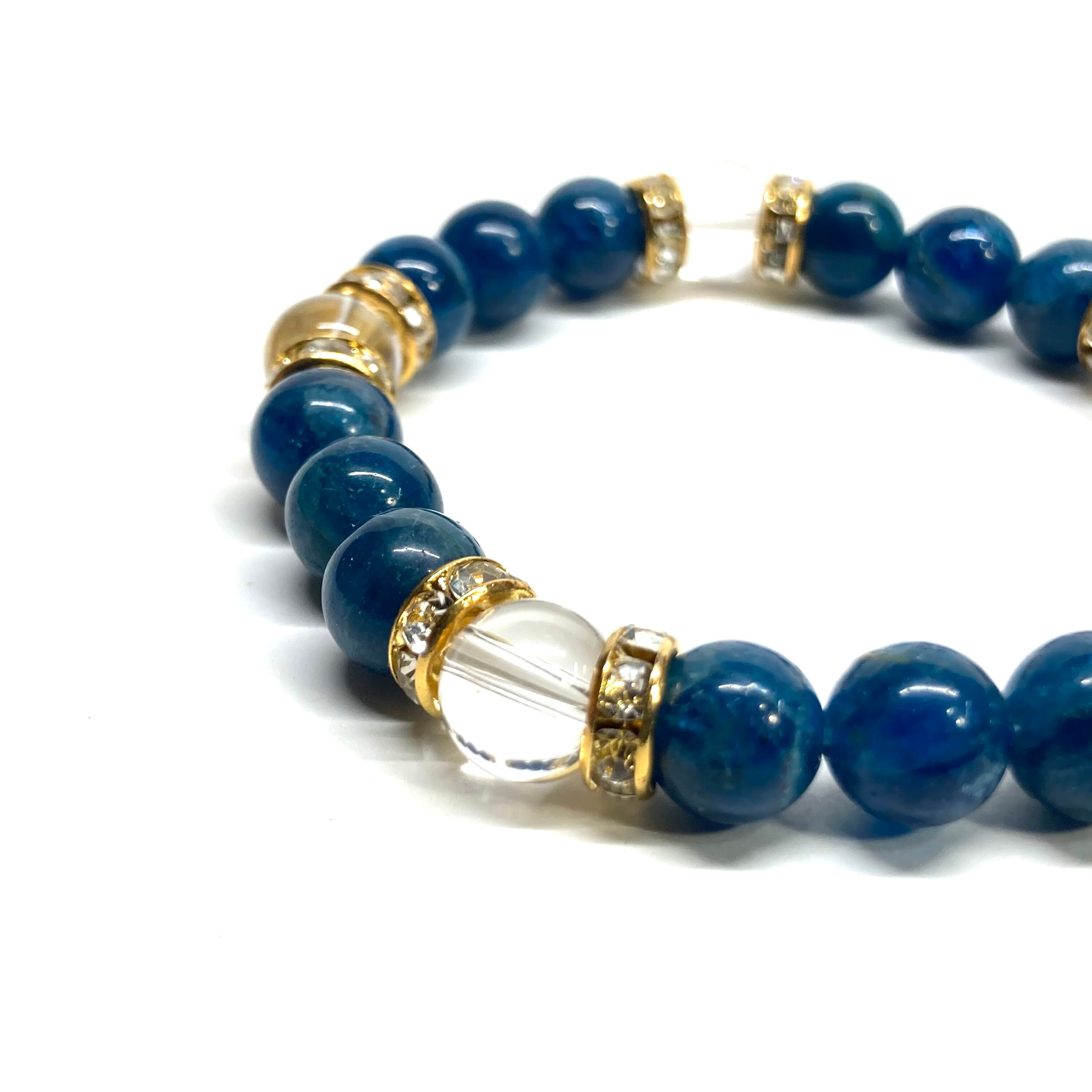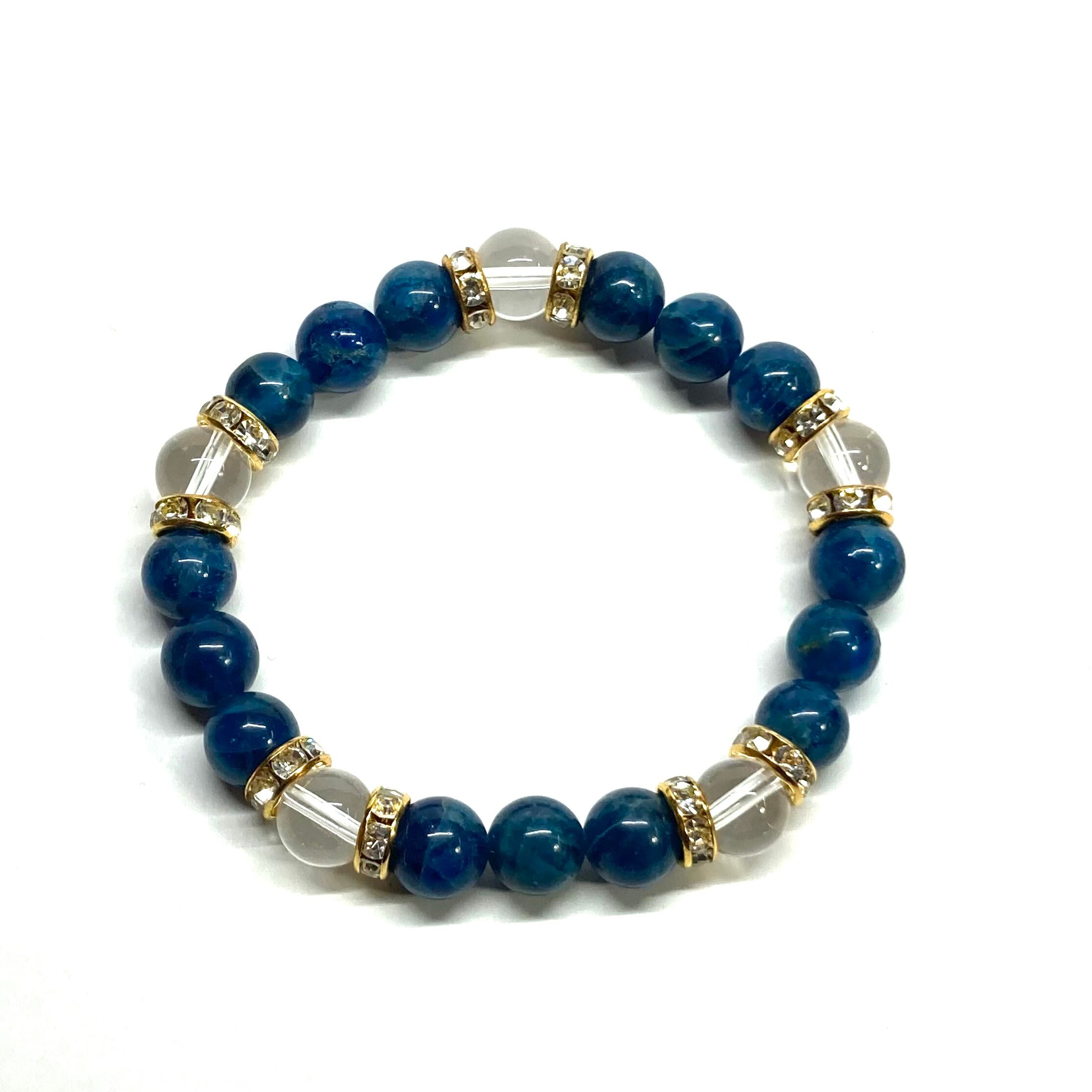 こちらは、8mm玉のアパタイトと水晶を使ったパワーストーンブレスレットです。シンプルなデザインでどんなコーディネートにも合わせやすいデザインに仕上げています。サイズは内周約15cmです。気になる方は是非この機会にどうぞ。