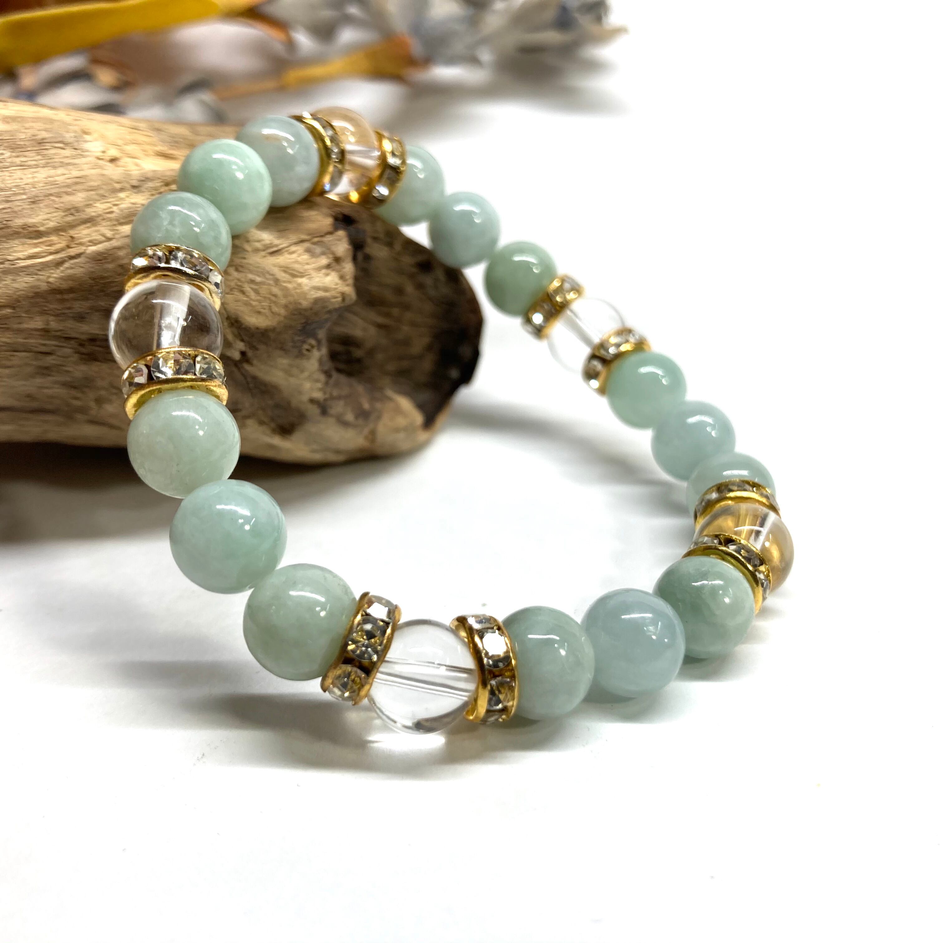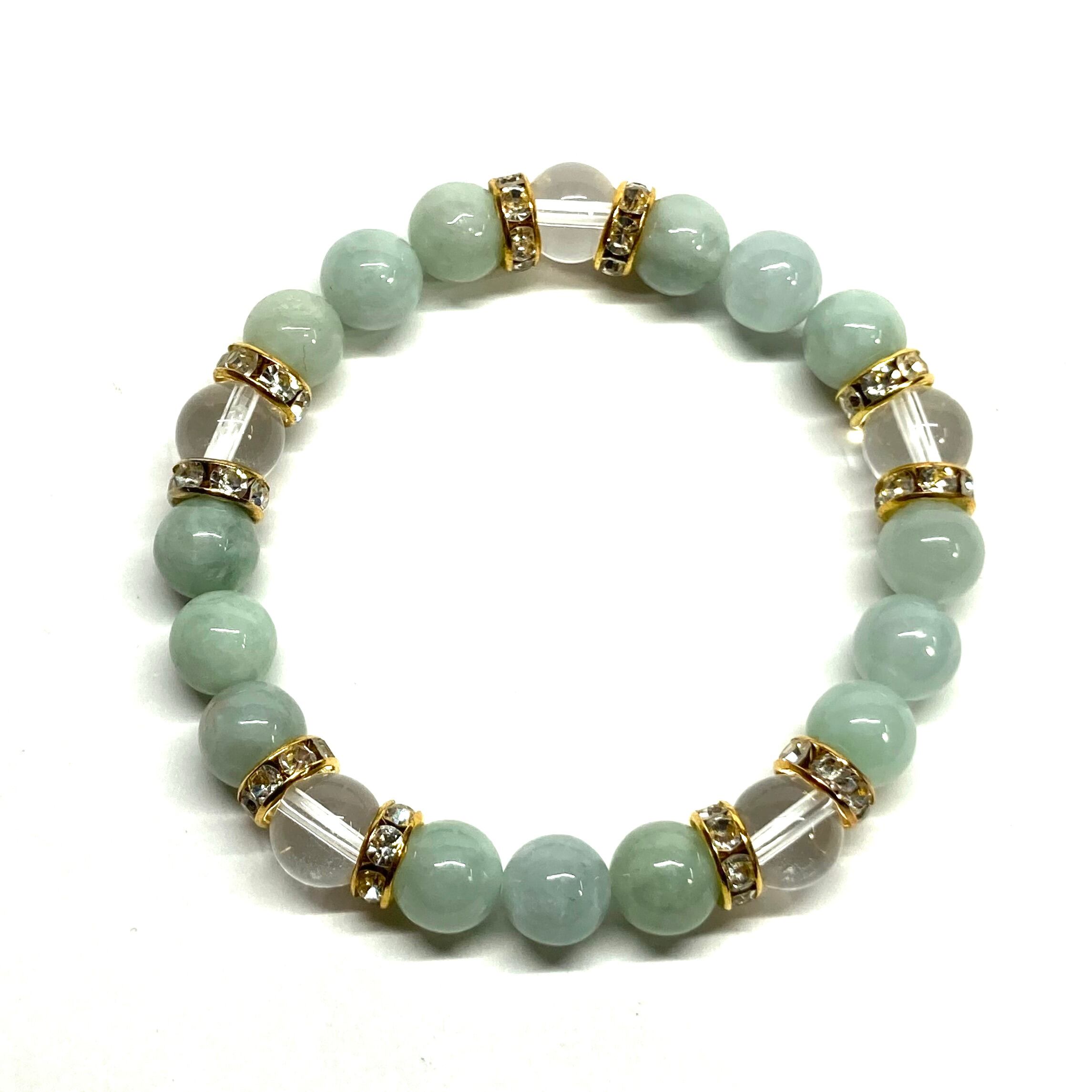 こちらは、8mm玉のビルマ翡翠と水晶を使ったパワーストーンブレスレットです。シンプルなデザインでどんなコーディネートにも合わせやすいデザインに仕上げています。サイズは内周約15cmです。気になる方は是非この機会にどうぞ。