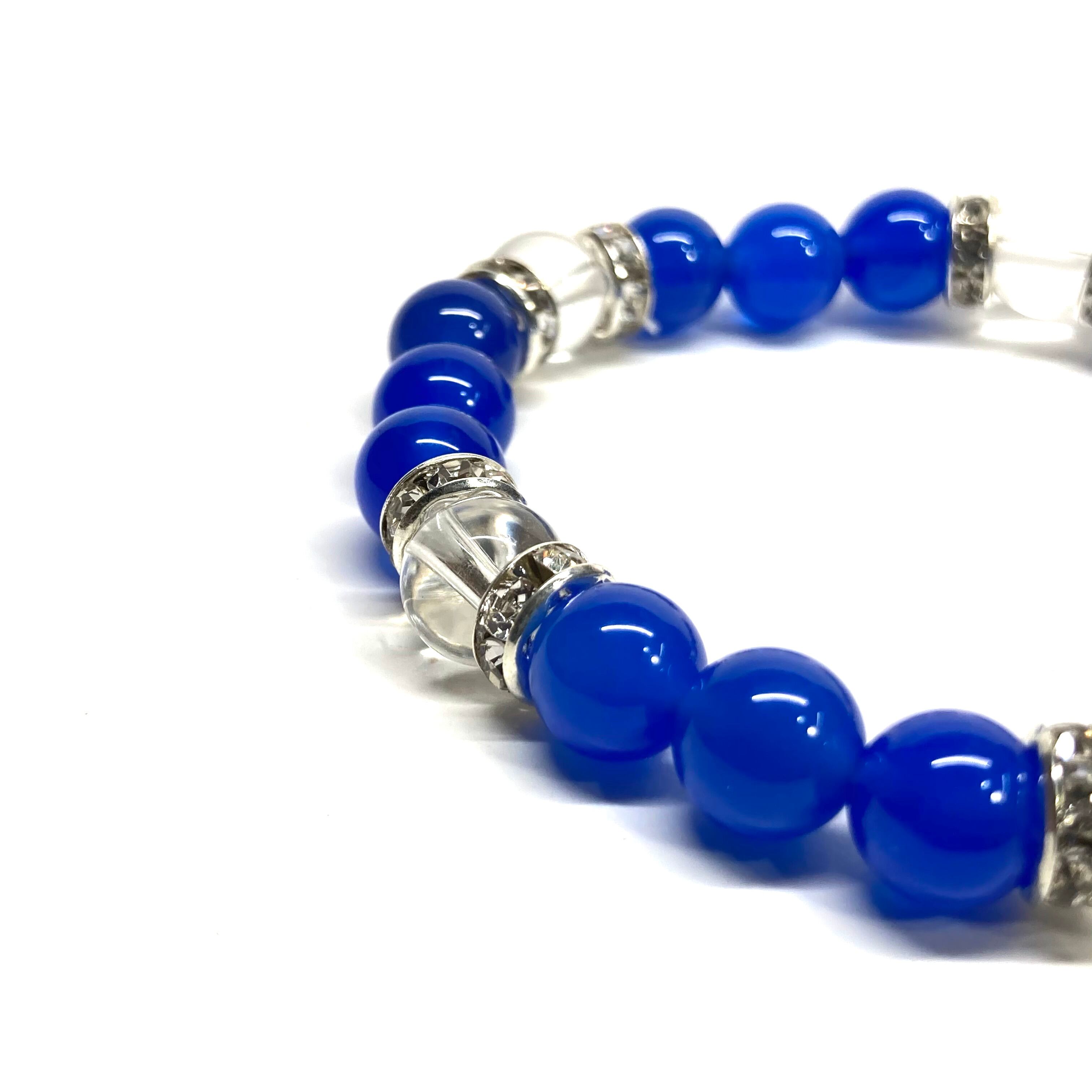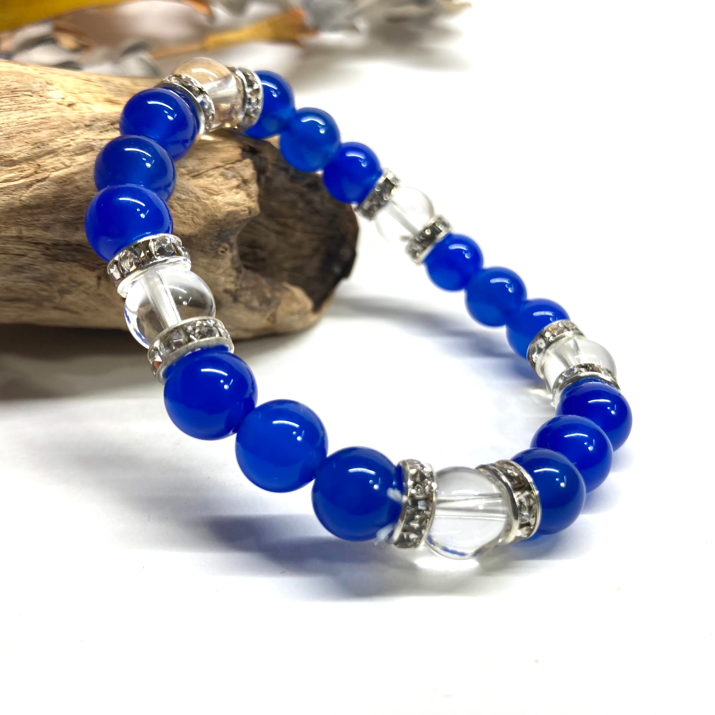こちらは、8mm玉の青瑪瑙と水晶を使ったパワーストーンブレスレットです。シンプルなデザインでどんなコーディネートにも合わせやすいデザインに仕上げています。サイズは内周約15cmです。気になる方は是非この機会にどうぞ。