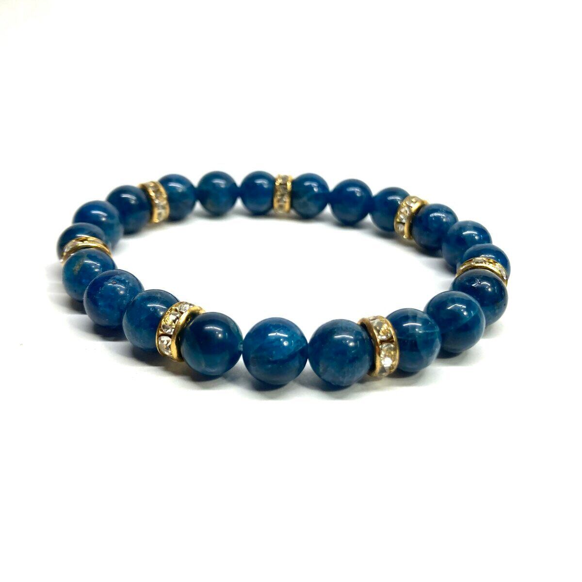 こちらは、8mm玉のアパタイトを使ったパワーストーンブレスレットです。シンプルなデザインでどんなコーディネートにも合わせやすいデザインに仕上げています。サイズは内周約15cmです。気になる方は是非この機会にどうぞ。