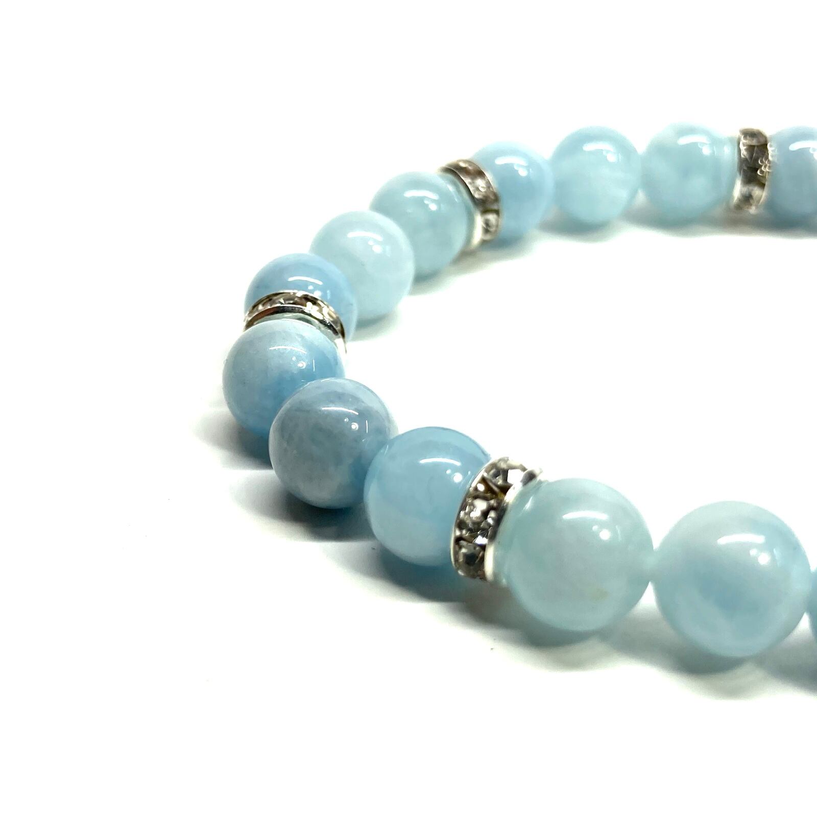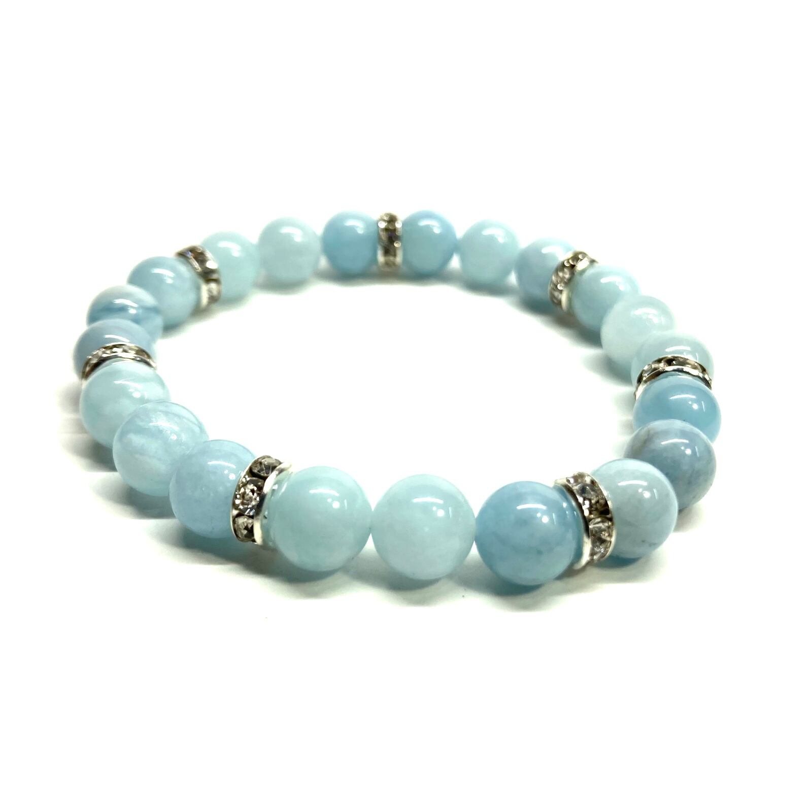 こちらは、8mm玉のアクアマリンを使ったパワーストーンブレスレットです。シンプルなデザインでどんなコーディネートにも合わせやすいデザインに仕上げています。サイズは内周約15cmです。気になる方は是非この機会にどうぞ。