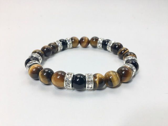 こちらは、8mm玉のタイガーアイとオニキスを使ったパワーストーンブレスレットです。シンプルなデザインでどんなコーディネートにも合わせやすいデザインに仕上げています。サイズは内周約15cmです。気になる方は是非この機会にどうぞ。