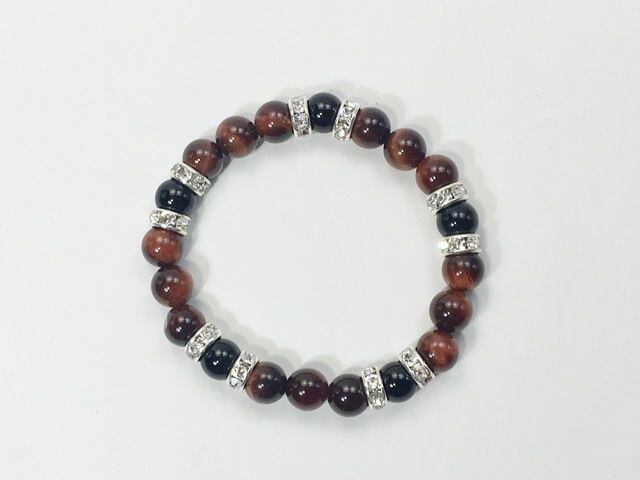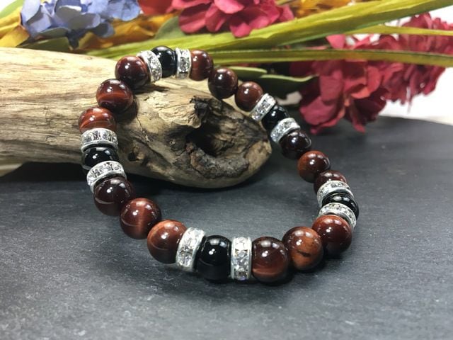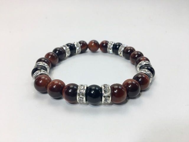 こちらは、8mm玉のレッドタイガーアイとオニキスを使ったパワーストーンブレスレットです。シンプルなデザインでどんなコーディネートにも合わせやすいデザインに仕上げています。サイズは内周約15cmです。気になる方は是非この機会にどうぞ。