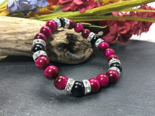 こちらは、8mm玉のピンクタイガーアイとオニキスを使ったパワーストーンブレスレットです。シンプルなデザインでどんなコーディネートにも合わせやすいデザインに仕上げています。サイズは内周約15cmです。気になる方は是非この機会にどうぞ。