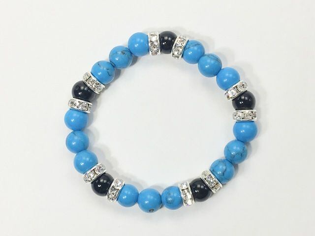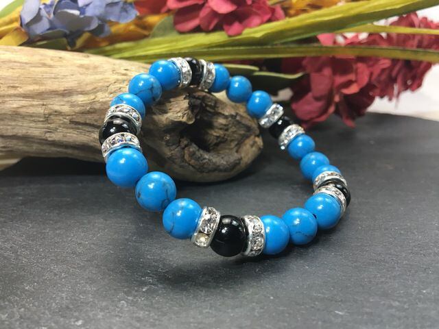 こちらは、8mm玉のターコイズとオニキスを使ったパワーストーンブレスレットです。シンプルなデザインでどんなコーディネートにも合わせやすいデザインに仕上げています。サイズは内周約15cmです。気になる方は是非この機会にどうぞ。
