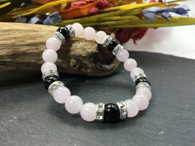 こちらは、8mm玉のローズクォーツとオニキスを使ったパワーストーンブレスレットです。シンプルなデザインでどんなコーディネートにも合わせやすいデザインに仕上げています。サイズは内周約15cmです。気になる方は是非この機会にどうぞ。