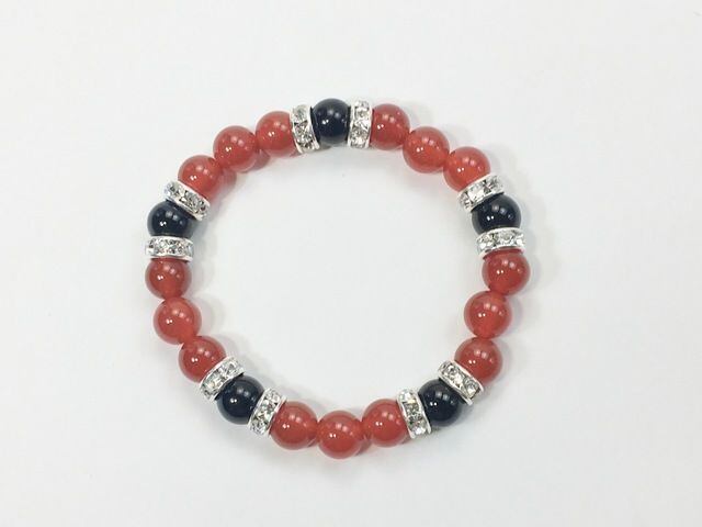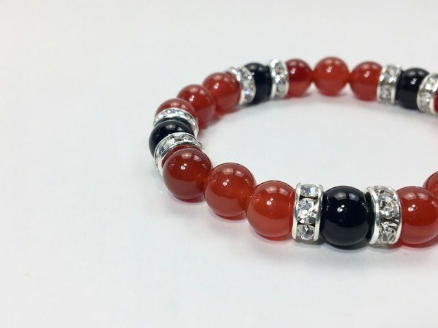 こちらは、8mm玉の赤瑪瑙とオニキスを使ったパワーストーンブレスレットです。シンプルなデザインでどんなコーディネートにも合わせやすいデザインに仕上げています。サイズは内周約15cmです。気になる方は是非この機会にどうぞ。