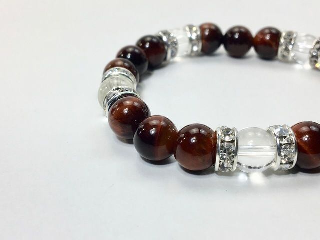 こちらは、8mm玉のレッドタイガーアイと水晶を使ったパワーストーンブレスレットです。シンプルなデザインでどんなコーディネートにも合わせやすいデザインに仕上げています。サイズは内周約15cmです。気になる方は是非この機会にどうぞ。