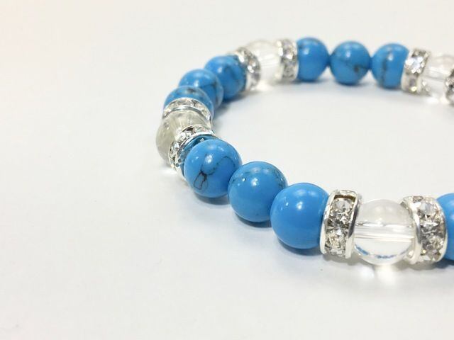 こちらは、8mm玉のターコイズと水晶を使ったパワーストーンブレスレットです。シンプルなデザインでどんなコーディネートにも合わせやすいデザインに仕上げています。サイズは内周約15cmです。気になる方は是非この機会にどうぞ。