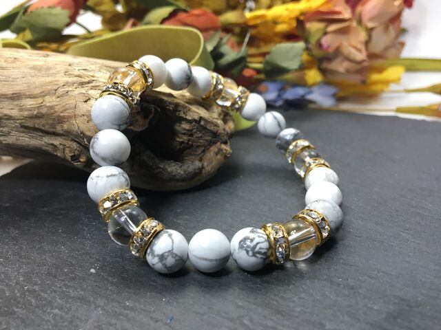 こちらは、8mm玉のハウライトと水晶を使ったパワーストーンブレスレットです。シンプルなデザインでどんなコーディネートにも合わせやすいデザインに仕上げています。サイズは内周約15cmです。気になる方は是非この機会にどうぞ。