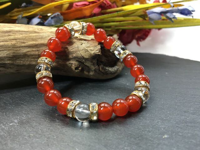 こちらは、8mm玉の赤瑪瑙と水晶を使ったパワーストーンブレスレットです。シンプルなデザインでどんなコーディネートにも合わせやすいデザインに仕上げています。サイズは内周約15cmです。気になる方は是非この機会にどうぞ。